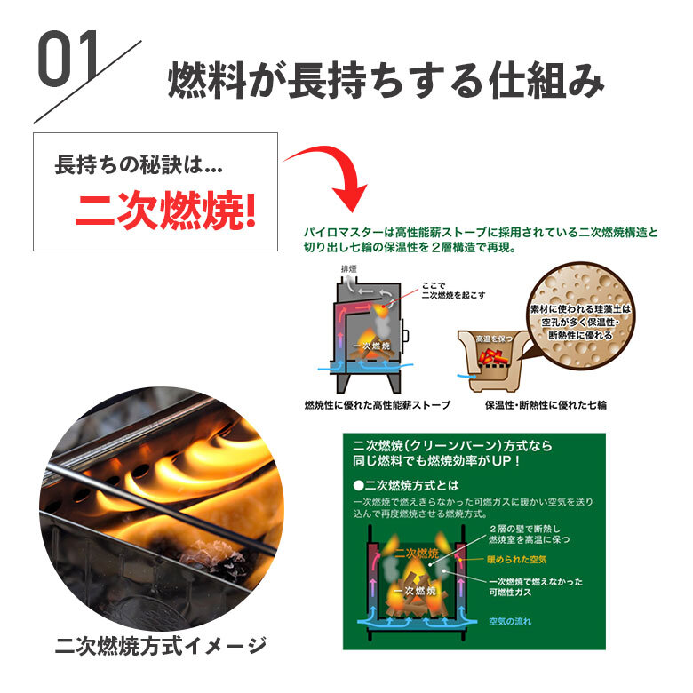 2層構造で燃料を無駄なく使い切る二次燃焼を実現。