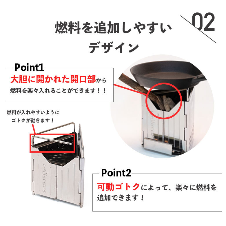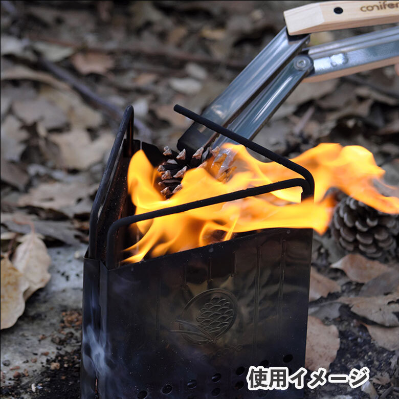 枯れ枝や松ぼっくりからウッドペレットや木炭まで様々な燃料に対応。