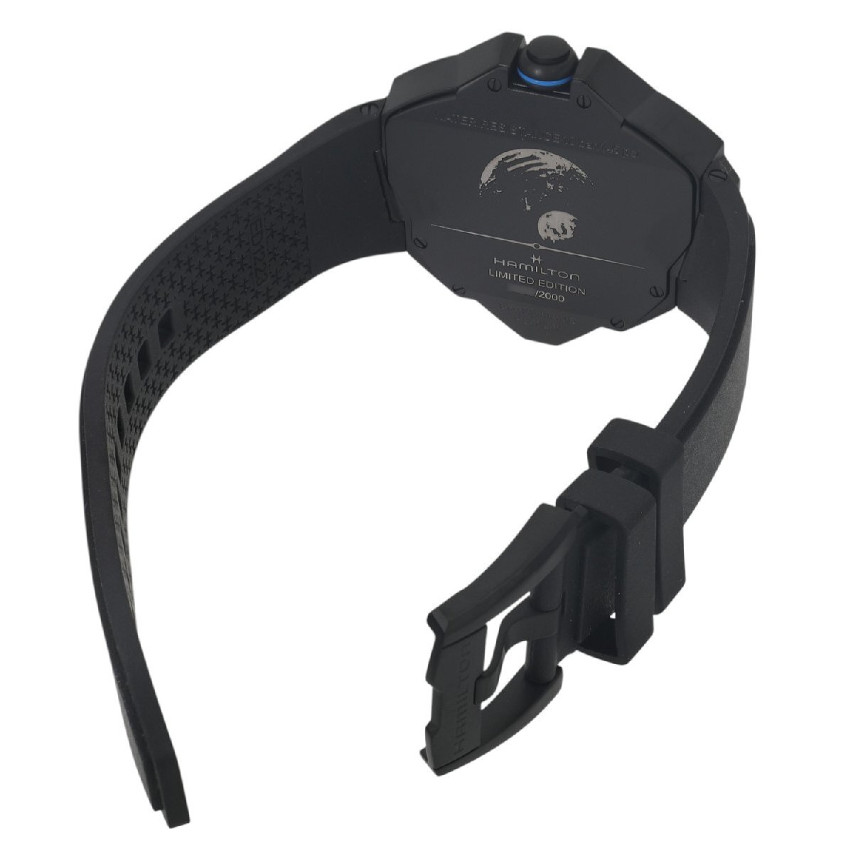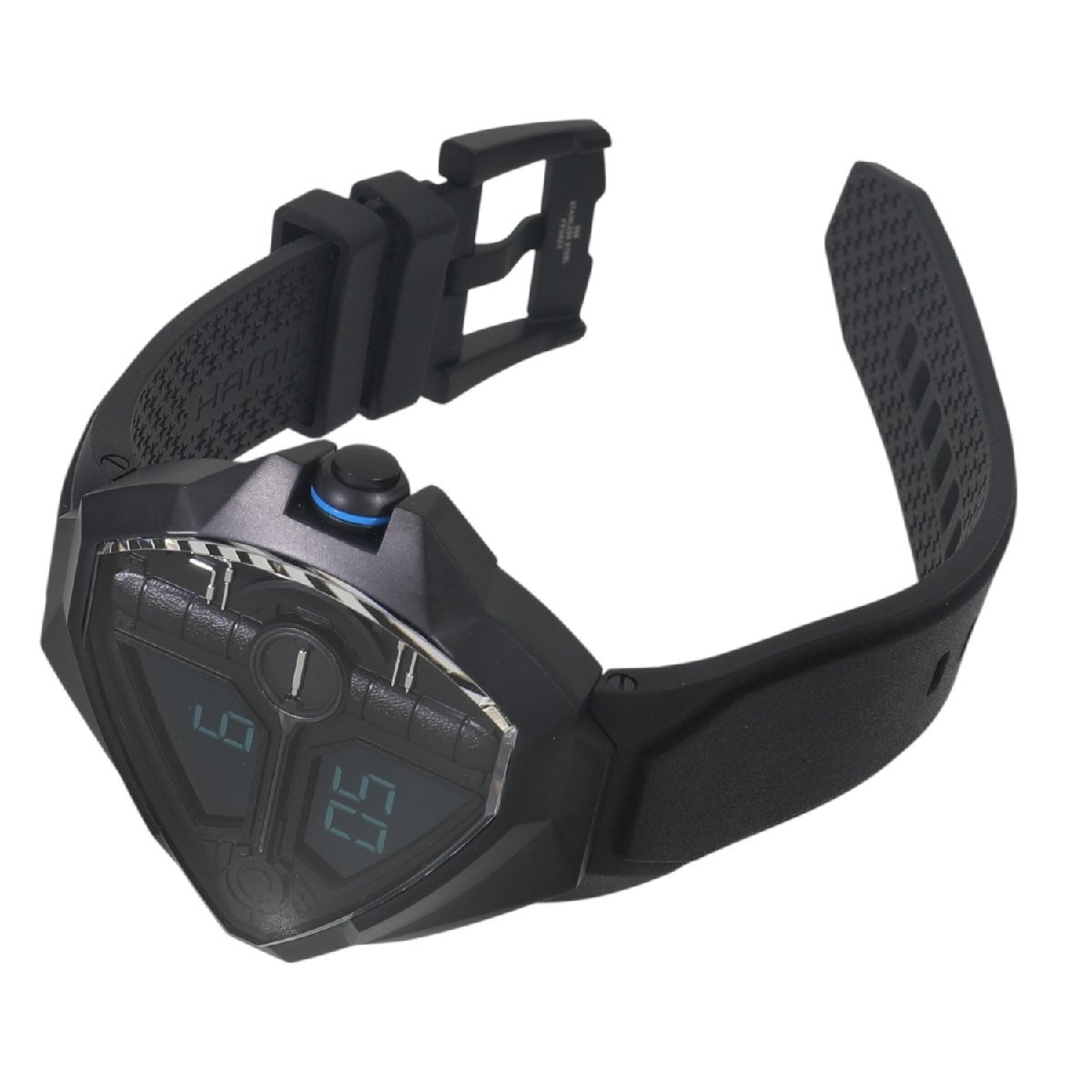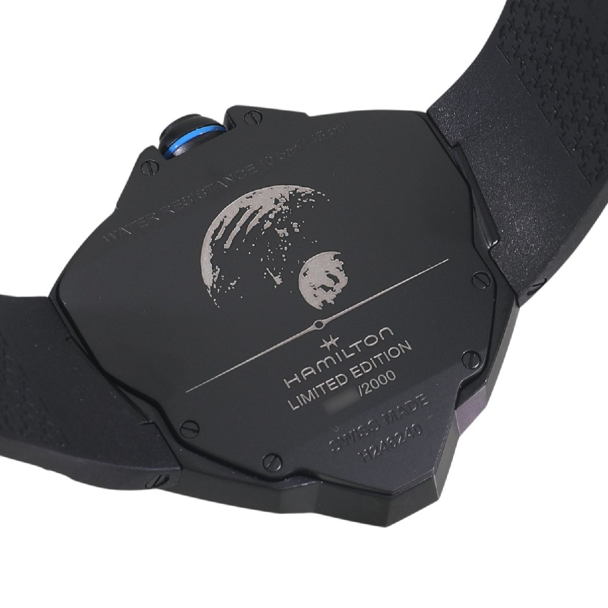 モデルについて | 左右非対称の三角形のケースが特徴的なヴェンチュラはハミルトンの象徴とも言えるコレクションです。ドゥニ・ヴィルヌーヴ監督の映画DUNE/デューン 砂の惑星の続編デューン 砂の惑星PART2のために、監督本人からオリジナルリストデバイスの制作オファーを受け、ハミルトン・×レジェンダリー・エンターテインメント×ワーナーブラザースとのコラボレーションモデルとして誕生しました。昨今注目を集めるレトロフューチャーなデザインが特徴的で、リュウズを1度プッシュすると時刻が光り、2度プッシュすると秒が表示されます。付属品にも拘りを見せており、作品にインスピレーションを受けたスペシャルパッケージのボックスが付いています |