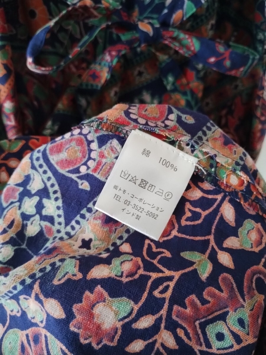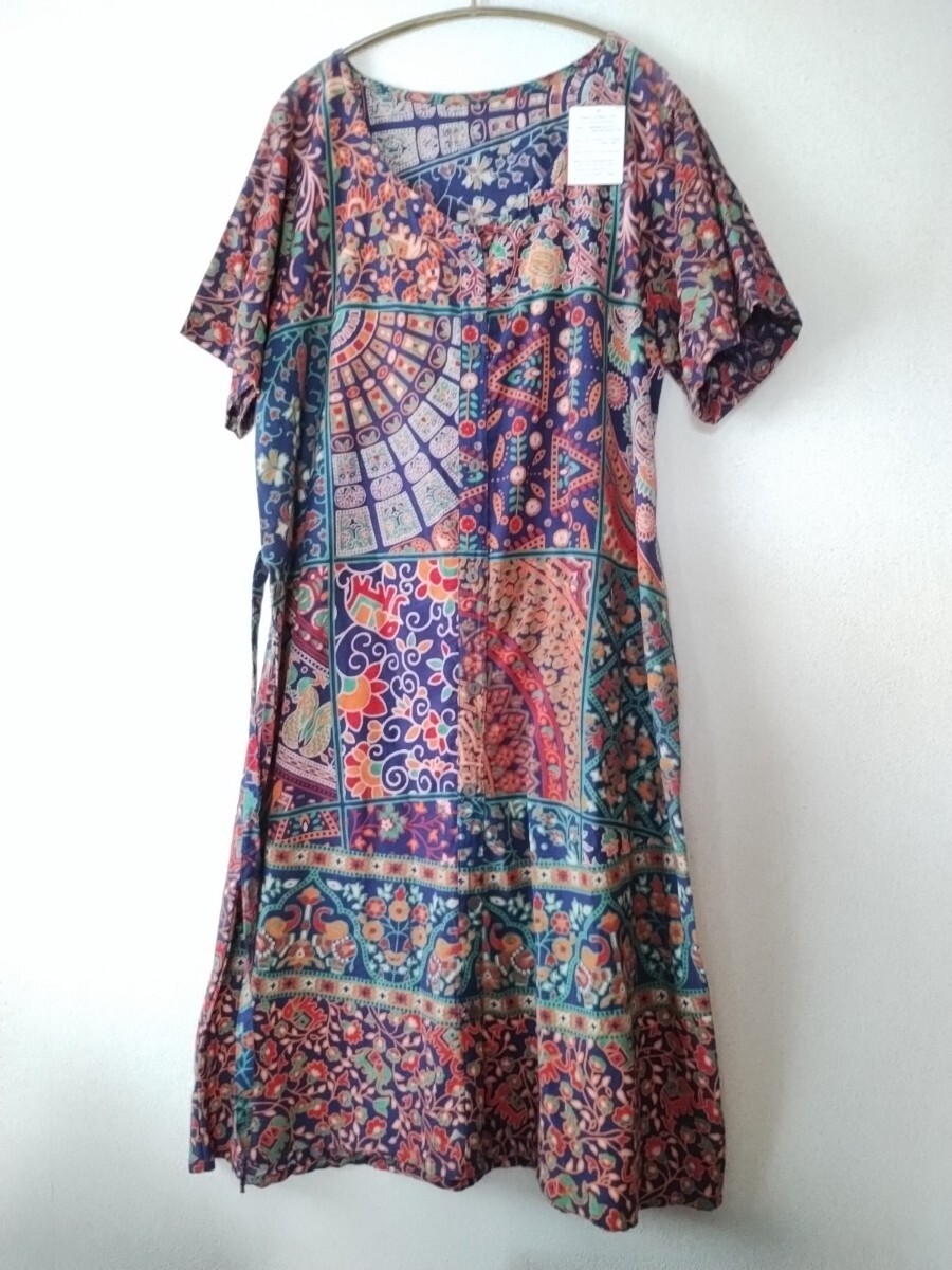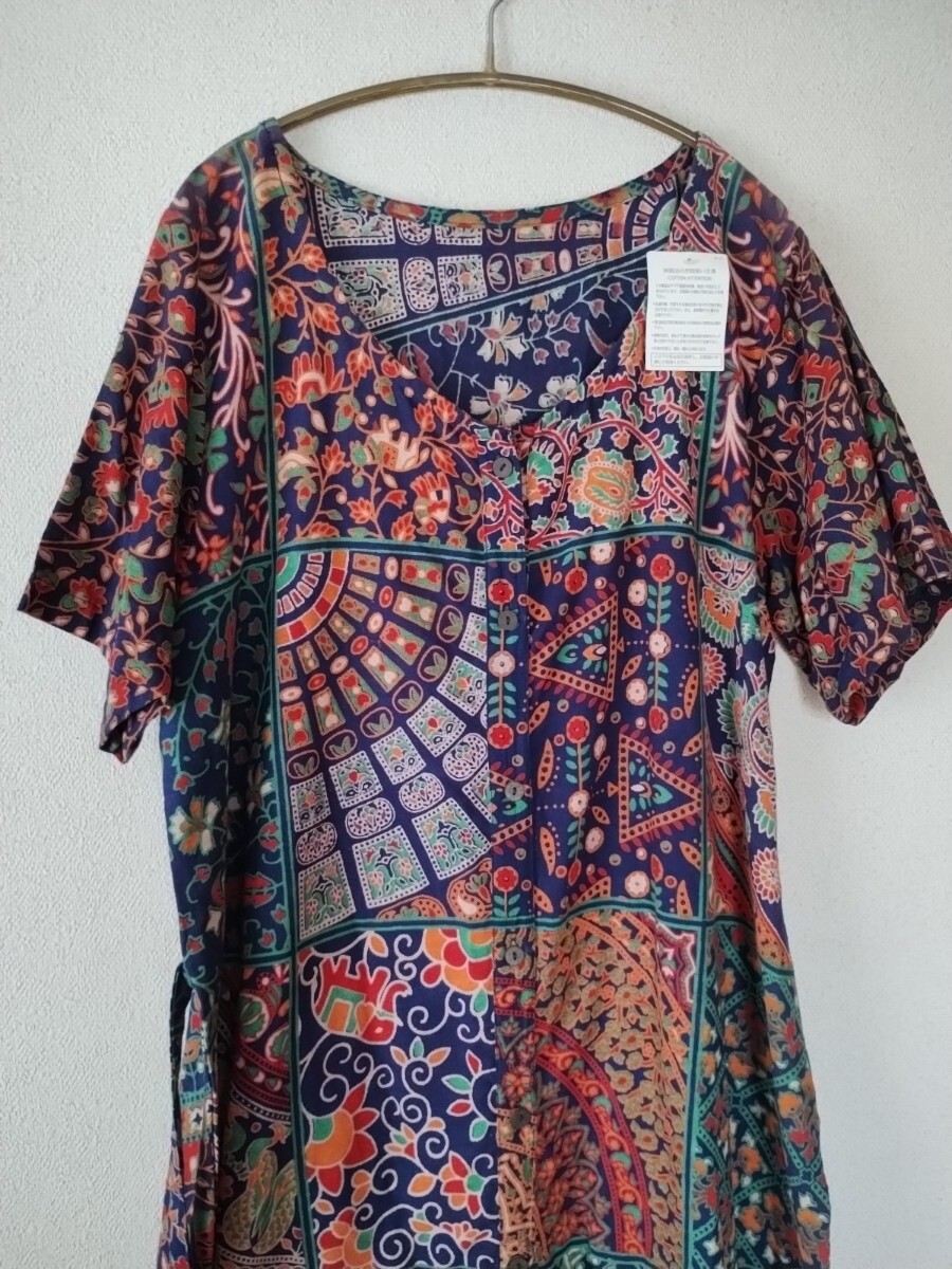 東洋の文様をポップにアレンジした象や花唐草プリント生地のワンピースです。