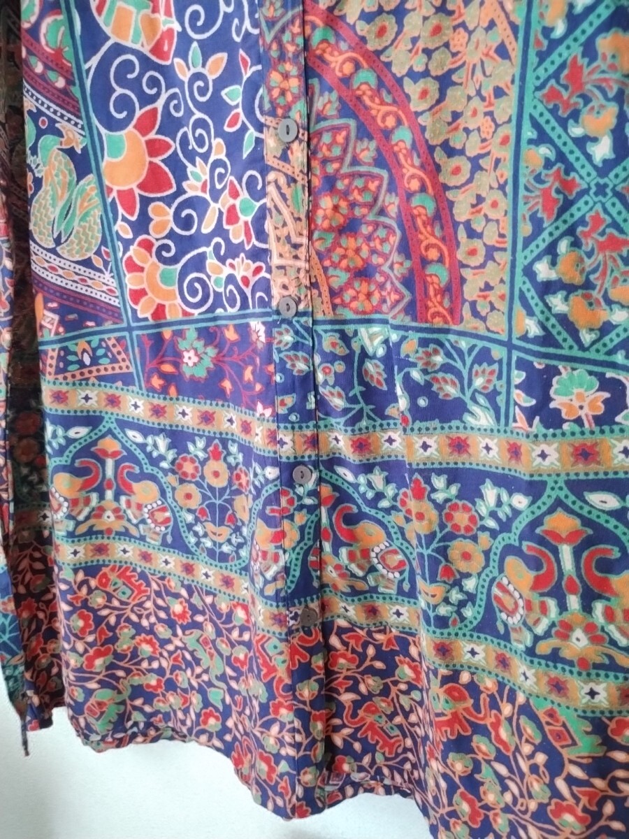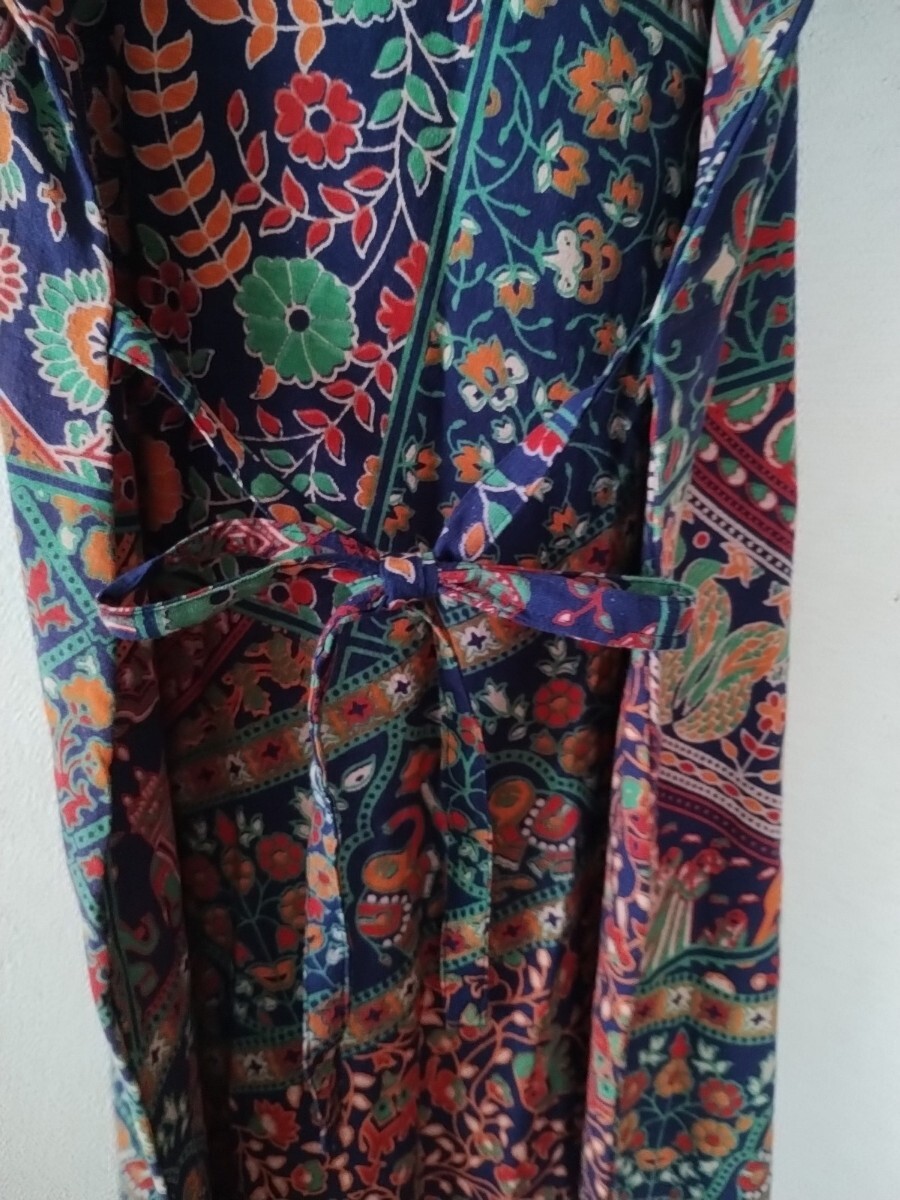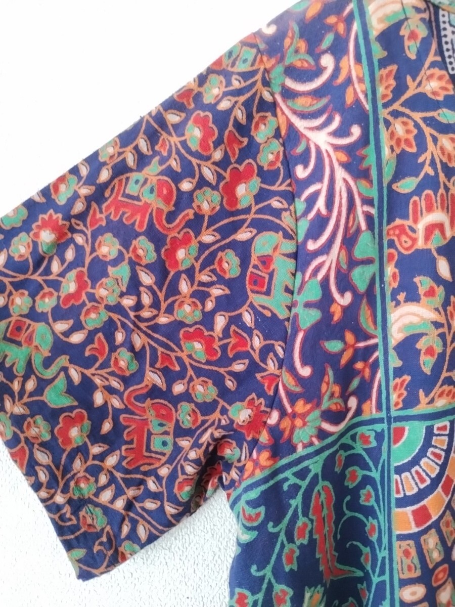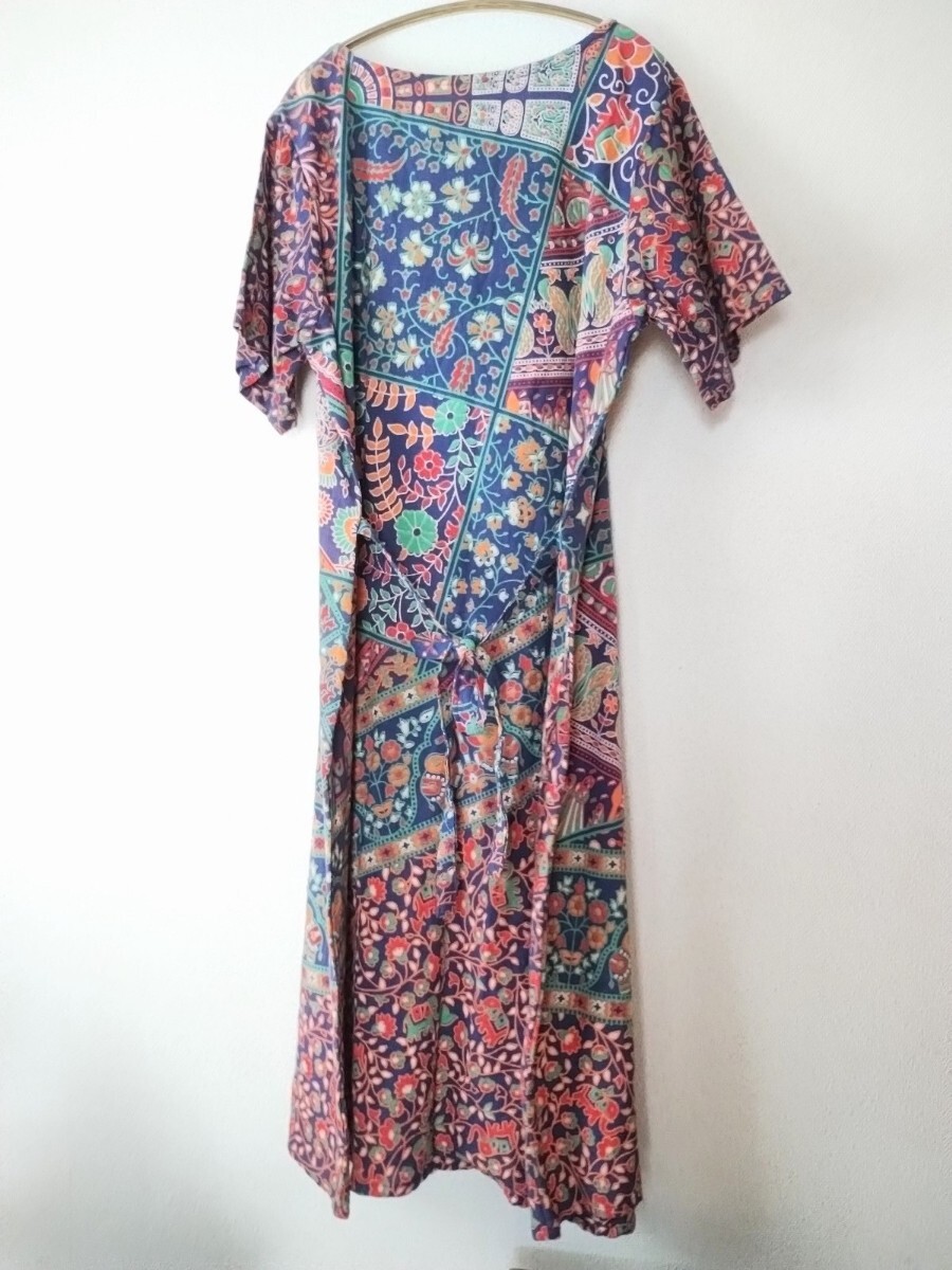 東洋の文様をポップにアレンジした象や花唐草プリント生地のワンピースです。