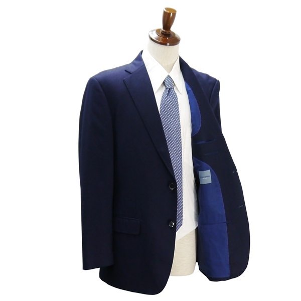 ・春秋冬対応。イタリア製カノニコ使用。段返り3つボタンシングル。総裏地仕上げ。サイドベンツ。フラップポケット。ネーム刺繍なし。開き見せ。