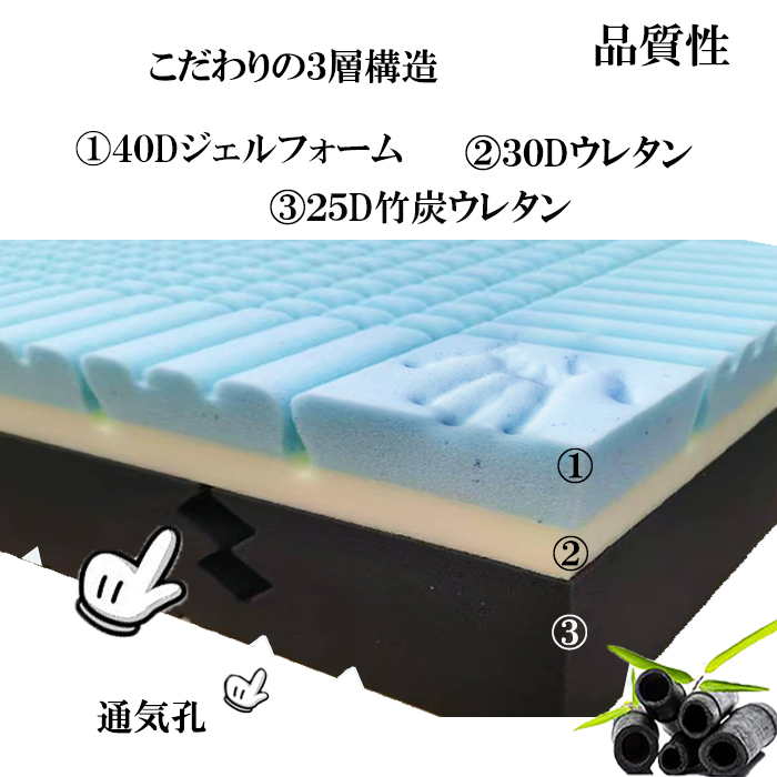 3層構造設計: 体圧分散に優れた3層構造で、快適な睡眠をサポート。通気性の高い4Dメッシュ生地と23cm厚のマットレスが快適な寝心地を提供 優れた通気性: 全周に290gの高級4Dメッシュ生地を採用し、湿気を溜めにくい構造。通気孔付きで年中快適な寝心地を実現 体圧分散機能: 3Dセルジェルメモリーフォームが体のカーブに沿ってフィットし、理想的な寝姿勢をサポート 温度調節機能: ジェル粒子が夏は涼しく冬は暖かい快適な温度環境を維持。季節を問わず快適な睡眠を実現 実用的な機能: エッジサポート設計で端まで快適な寝心地を実現。竹炭配合で消臭効果も備えた実用的な設計