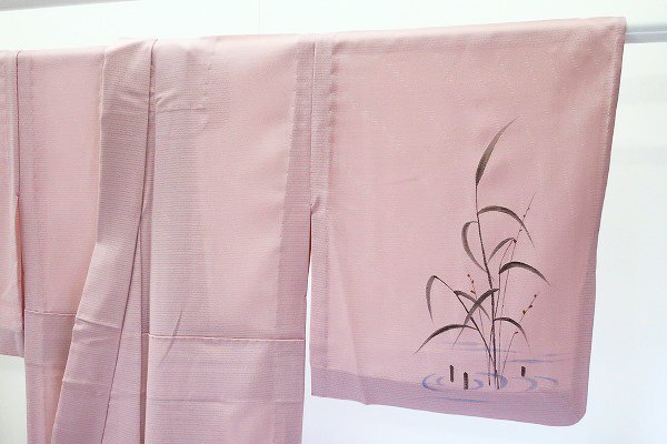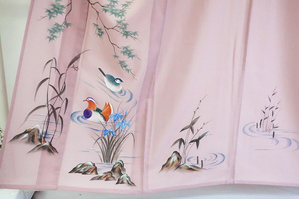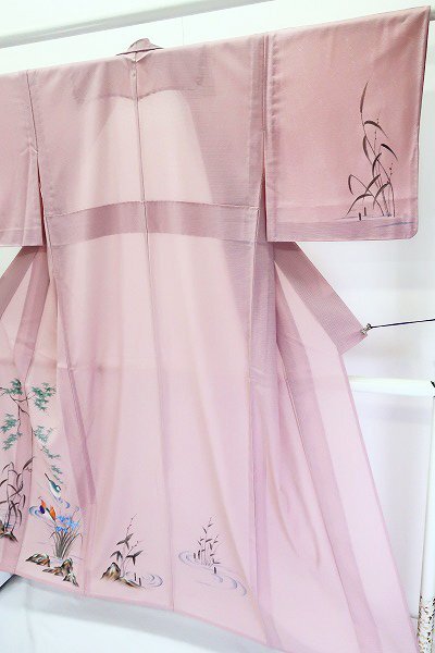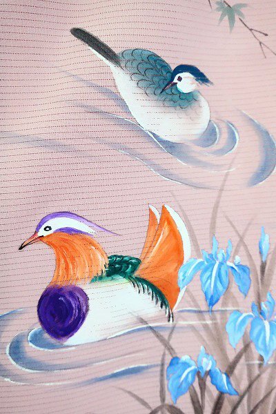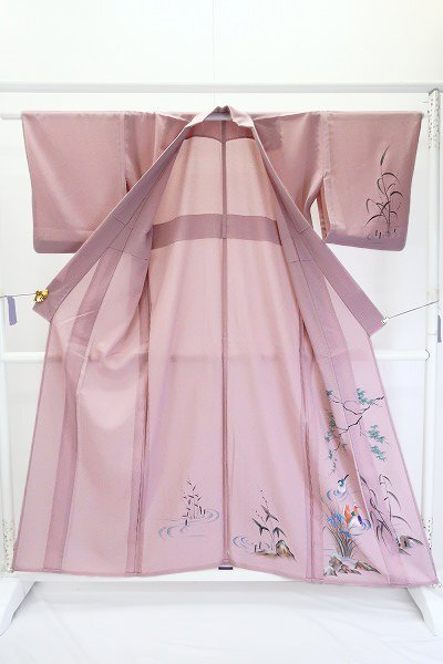 くすんだ紫みのピンクの絽織り地に水辺の鴛鴦が描かれた洗える付け下げです。 夏のお出かけにいかがでしょうか。 担当:伊藤 |