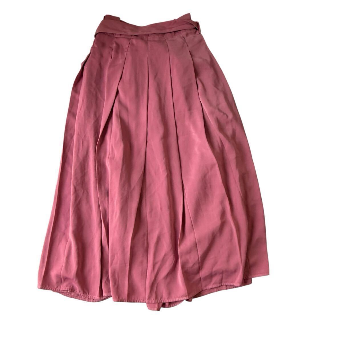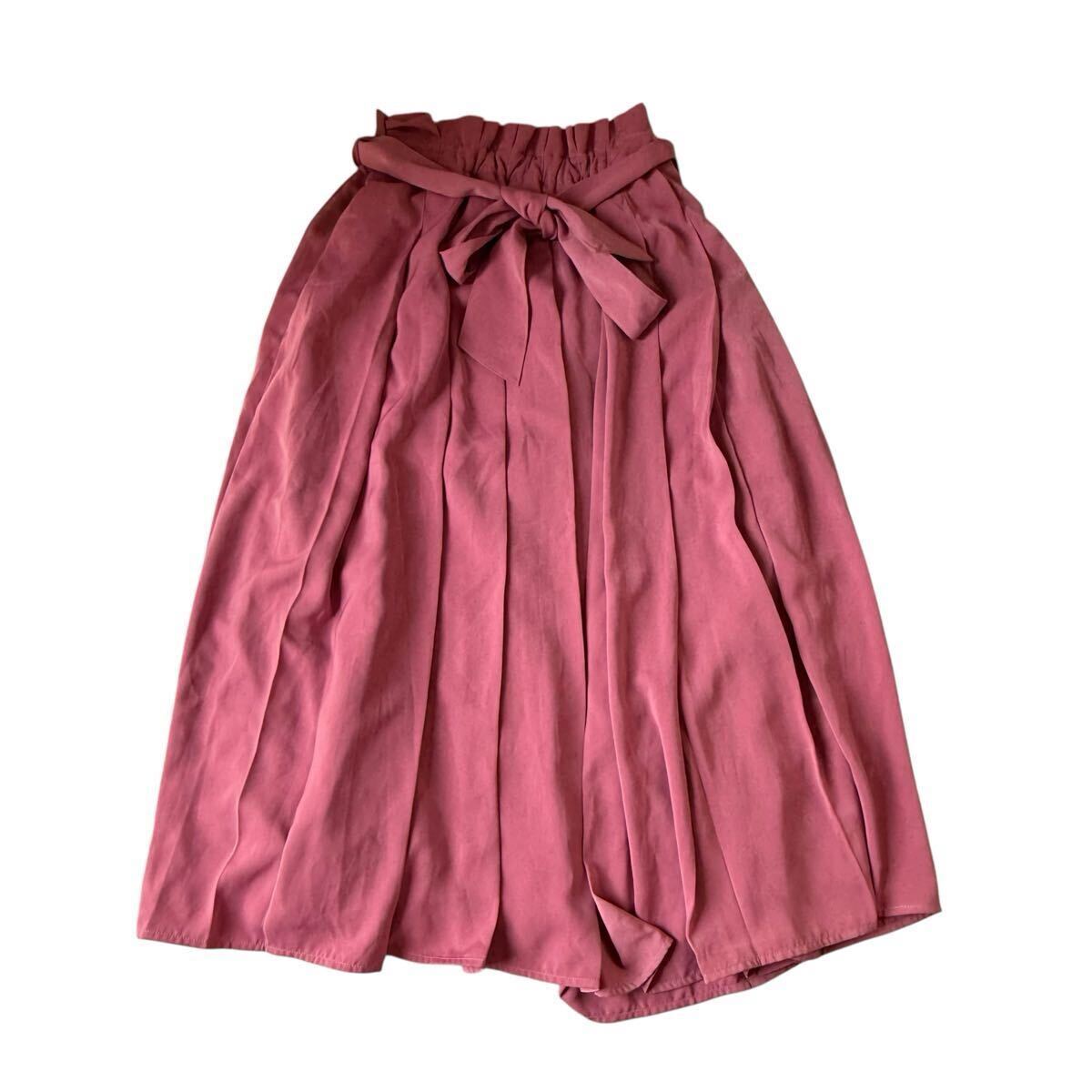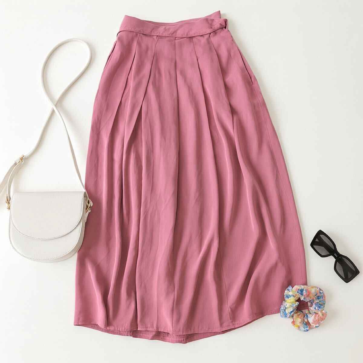 落ち着いたくすみピンクが大人可愛いプリーツロングスカートです。白バッグと小物でコーデを引き立て、春夏のお出かけやデートにぴったり。軽やかな生地感で快適な着心地。