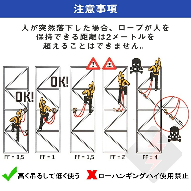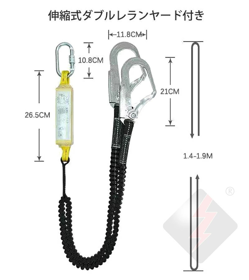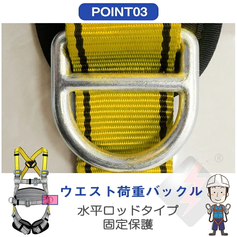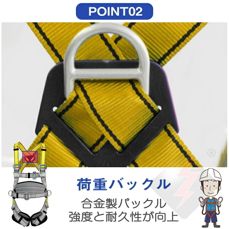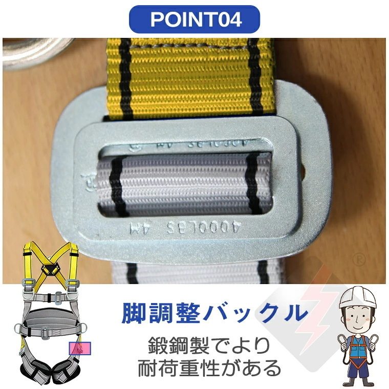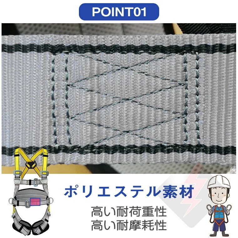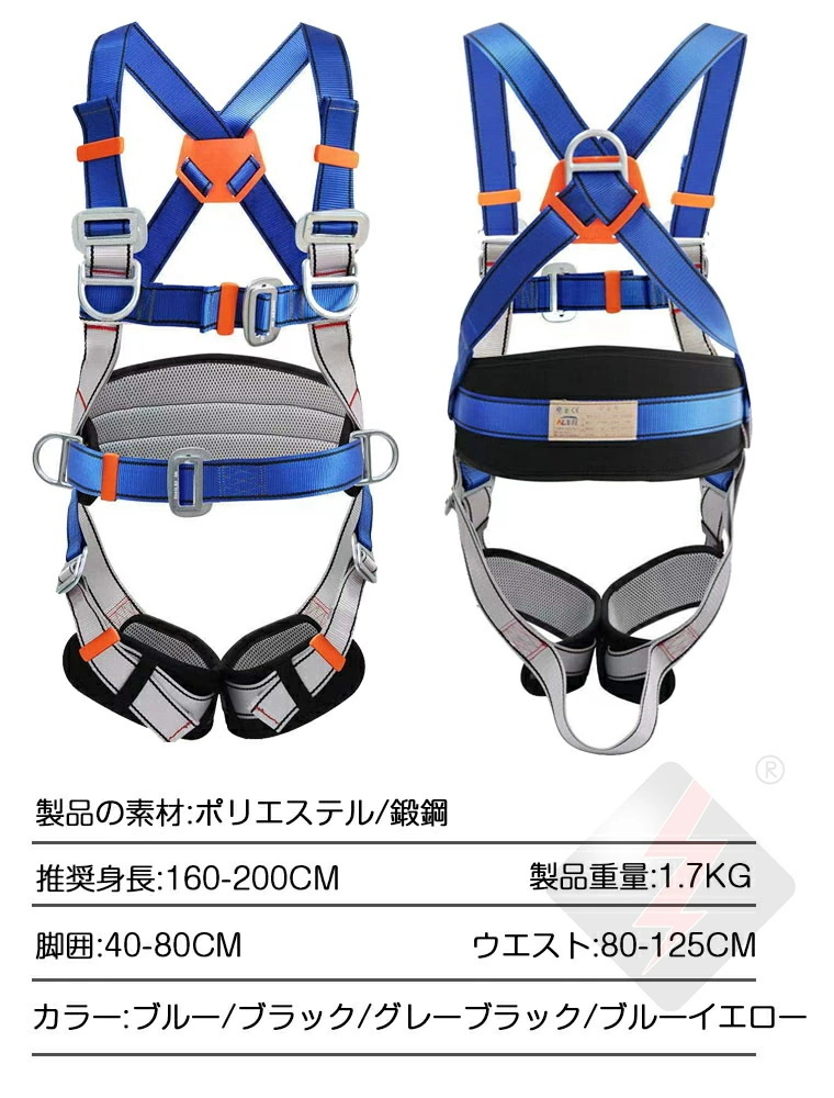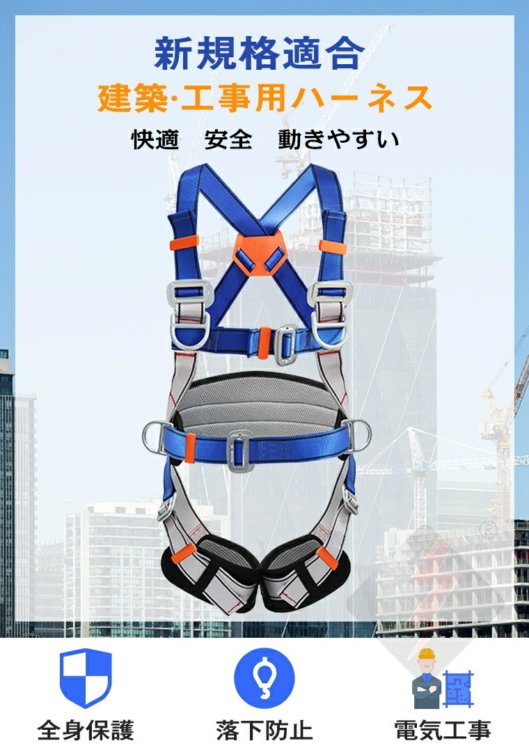 各部のサイズは調整できる、脱着簡単。ショックアブソーバーはついていますので、一旦落下時墜落時、フルハーネスは衝撃を体全体に分散し、人体への負担を軽減します。素材は高強度ポリエステルで、安全で信頼性があります。