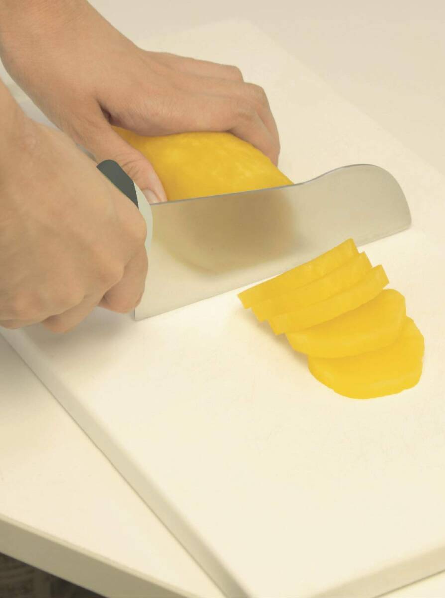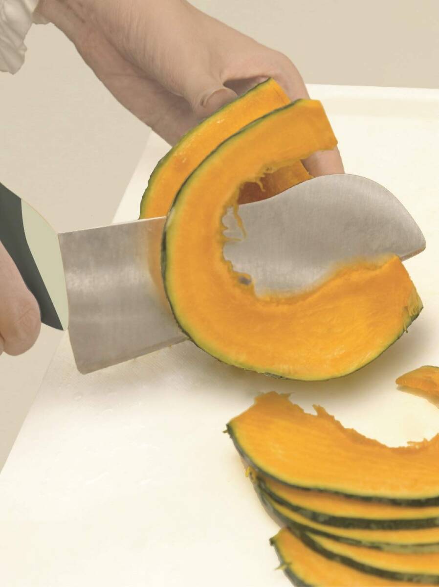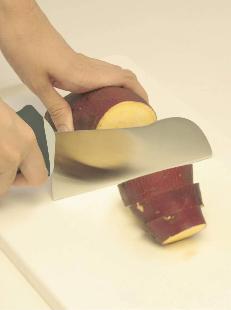 かぼちゃ切りの強い味方 力強く切ることができる「力点ハイポイント構造採用」 グリップの位置を高くし、高い位置から力が入れられるので切りやすくなっている 滑りにくく、優しい握りのエラストマー素材を使用 手の中で回らず、しっかり握れる楕円形状のグリップ 切り残りなしの「菜っ切り刃」 刃はまな板に対し隙間が少ないので、切った時の切残しも少なくなる かぼちゃ以外にも、さつまいも、とうもろこし、大根など硬い食材が切りやすい