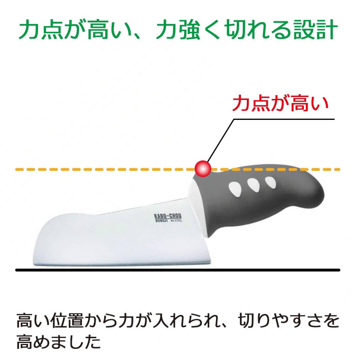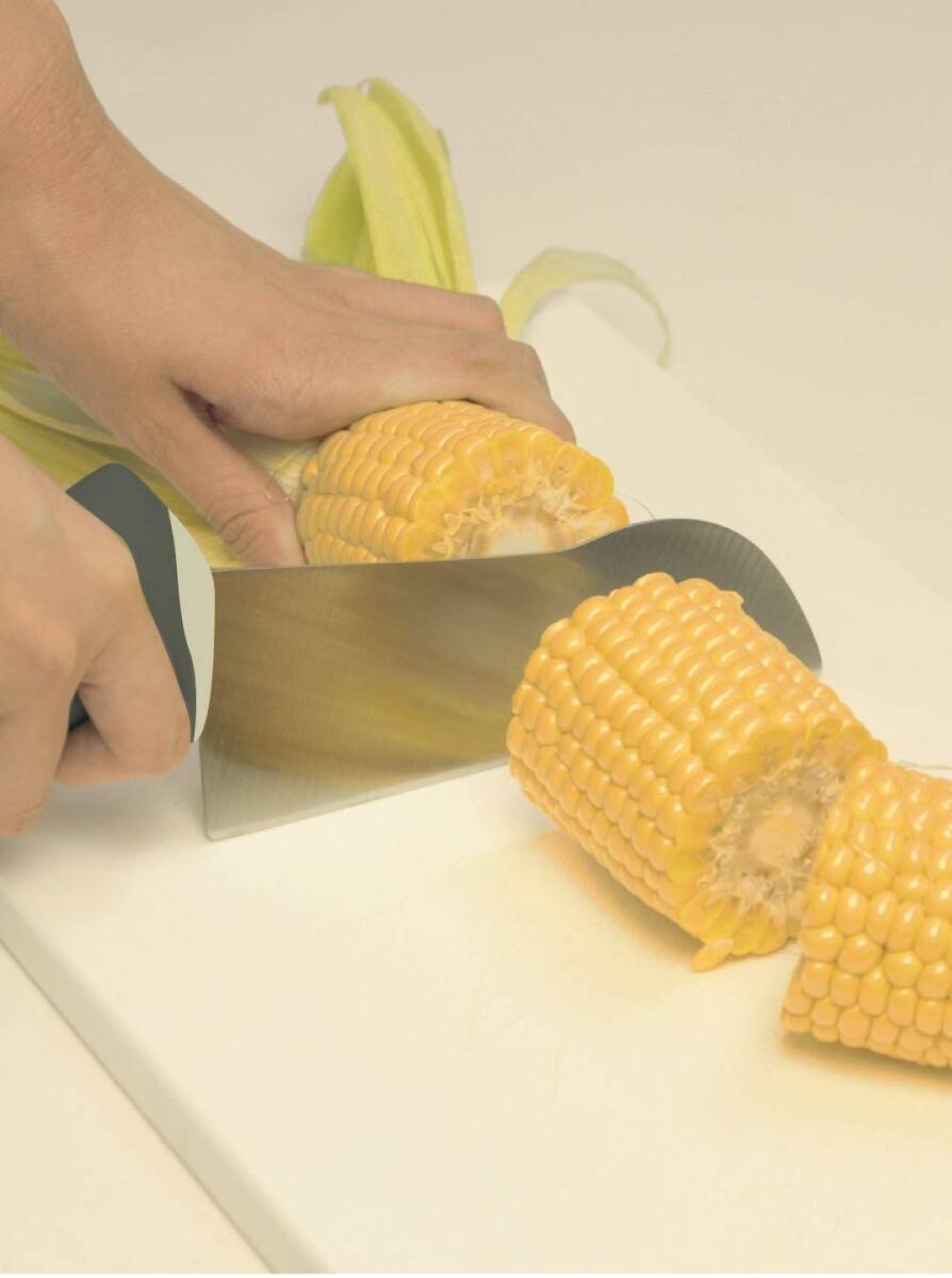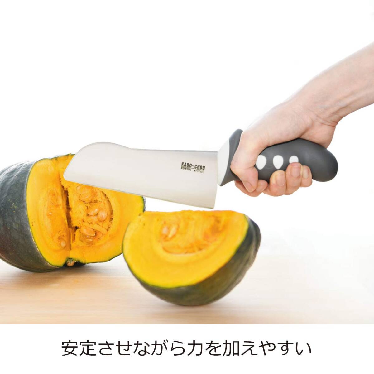 かぼちゃ切りの強い味方 力強く切ることができる「力点ハイポイント構造採用」 グリップの位置を高くし、高い位置から力が入れられるので切りやすくなっている 滑りにくく、優しい握りのエラストマー素材を使用 手の中で回らず、しっかり握れる楕円形状のグリップ 切り残りなしの「菜っ切り刃」 刃はまな板に対し隙間が少ないので、切った時の切残しも少なくなる かぼちゃ以外にも、さつまいも、とうもろこし、大根など硬い食材が切りやすい