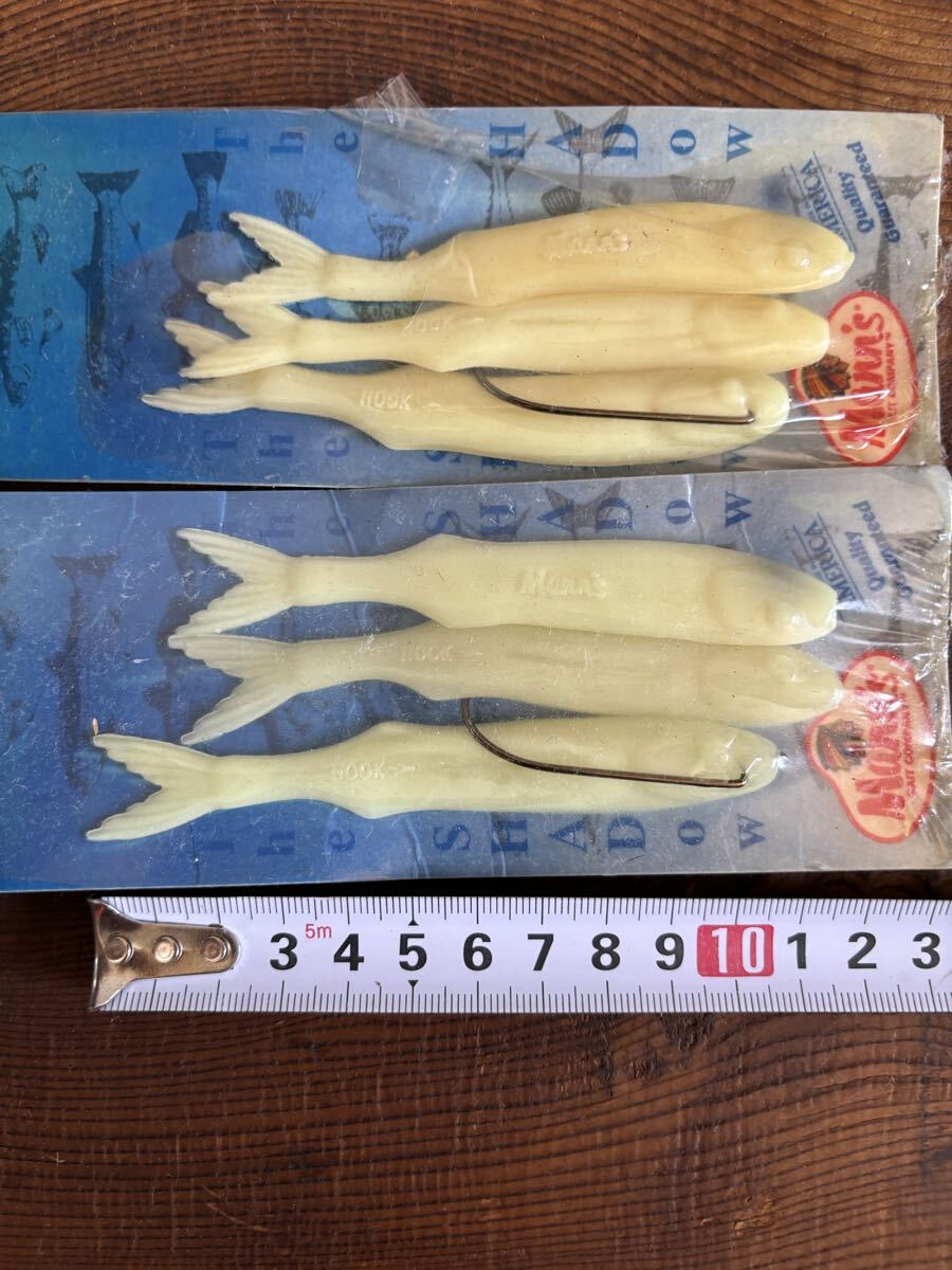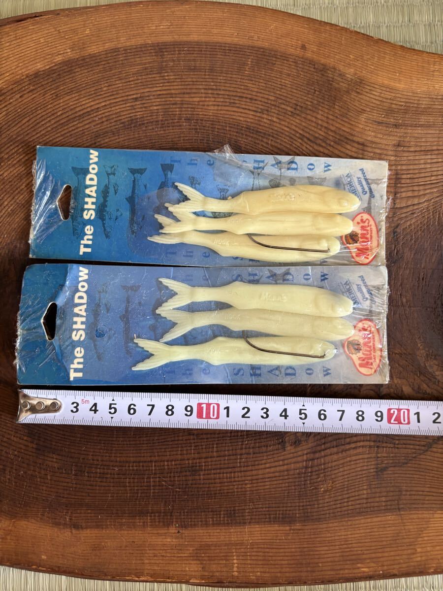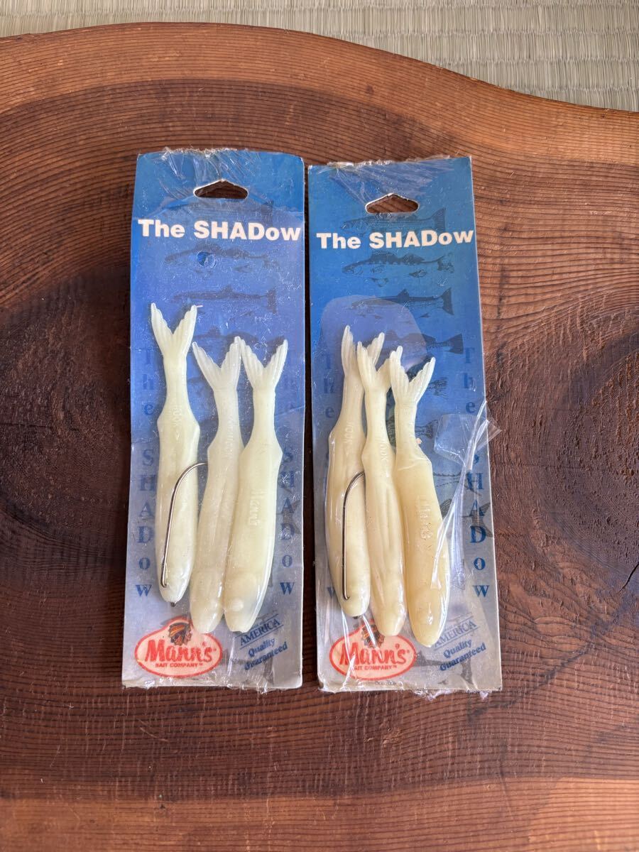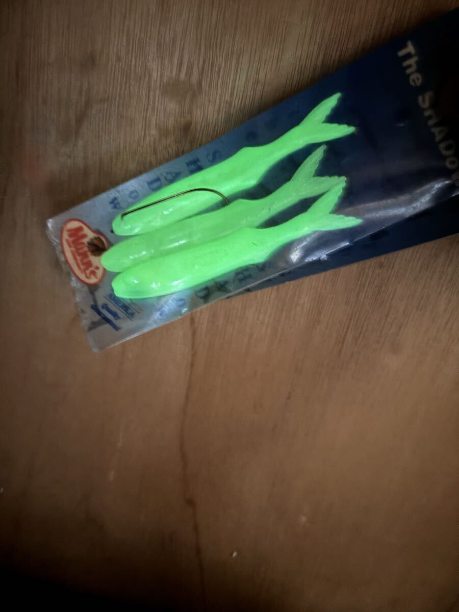 マンズ、ザシャドウ・夜光。使用してませんが、表面ビニール、一部劣化で、裂けてます。ワームフック、各1本ずつ刺してあります。