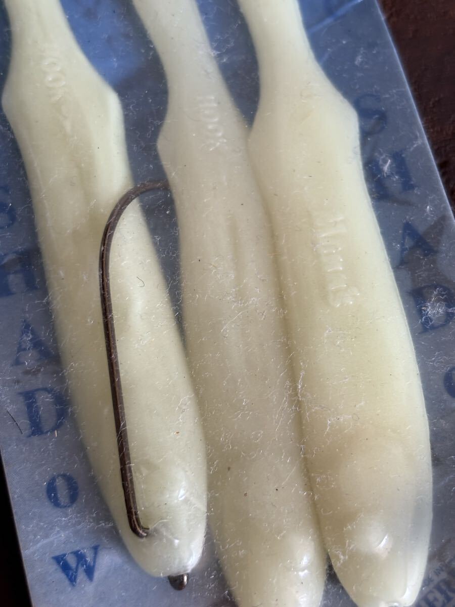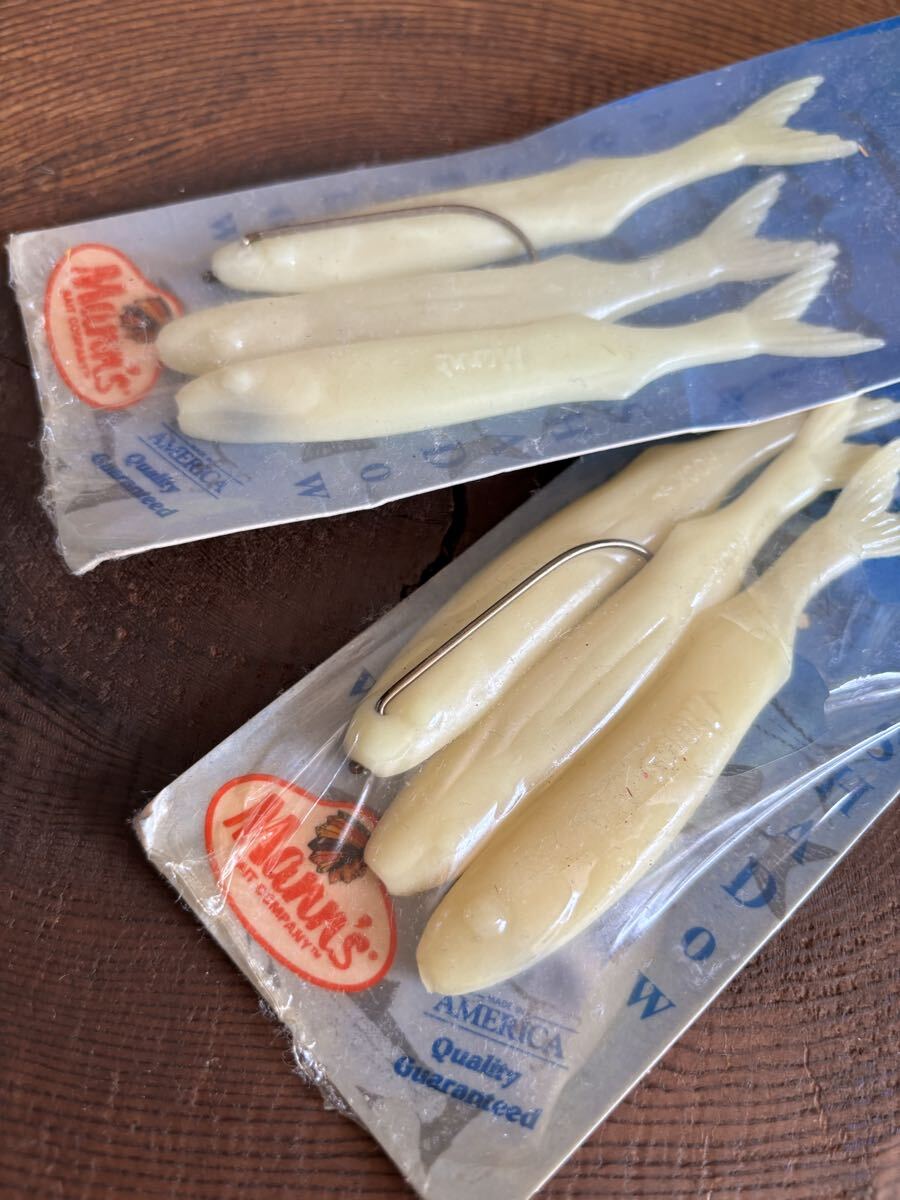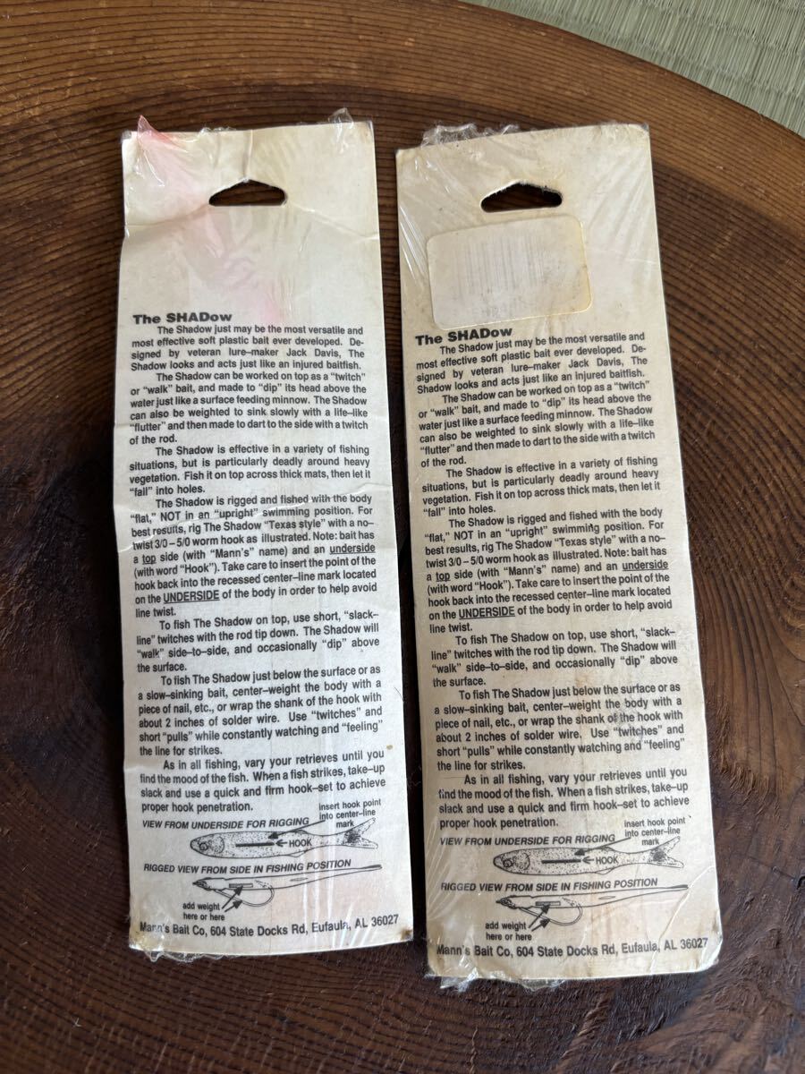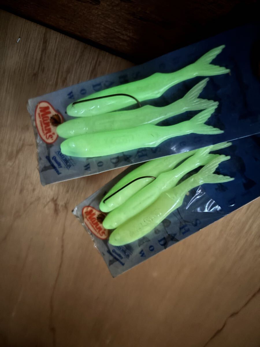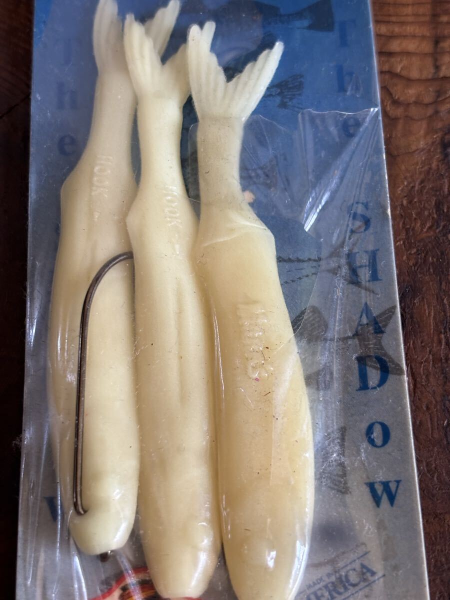 マンズ、ザシャドウ・夜光。使用してませんが、表面ビニール、一部劣化で、裂けてます。ワームフック、各1本ずつ刺してあります。