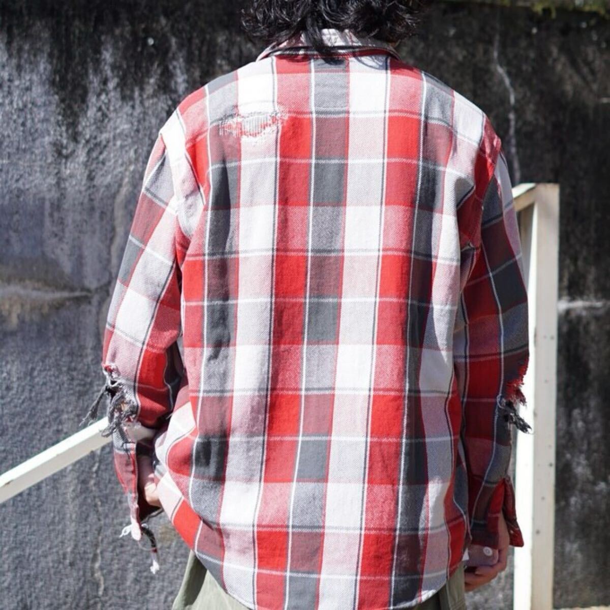 BOW WOWが得意とする、リアルなヴィンテージの風合いにこだわり、リアルさのあるエイジング加工やダメージ加工が魅力で、リペアの雰囲気にもこだわりを感じさせるネルシャツです。