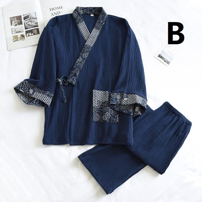 パジャマ メンズ 甚平 長袖 二重ガーゼ 綿100% 上下セット 前開き 和風 ルームウェア 入院用 プレゼント用3色/M-XLサイズ選択/1点ネイビーB