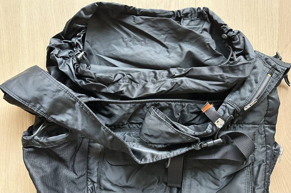 上部のバッグの取り出し口は量産品の多くはアラウンドジップになっていますが 、別注品は巾着形で左右をマジックで留める形式です。