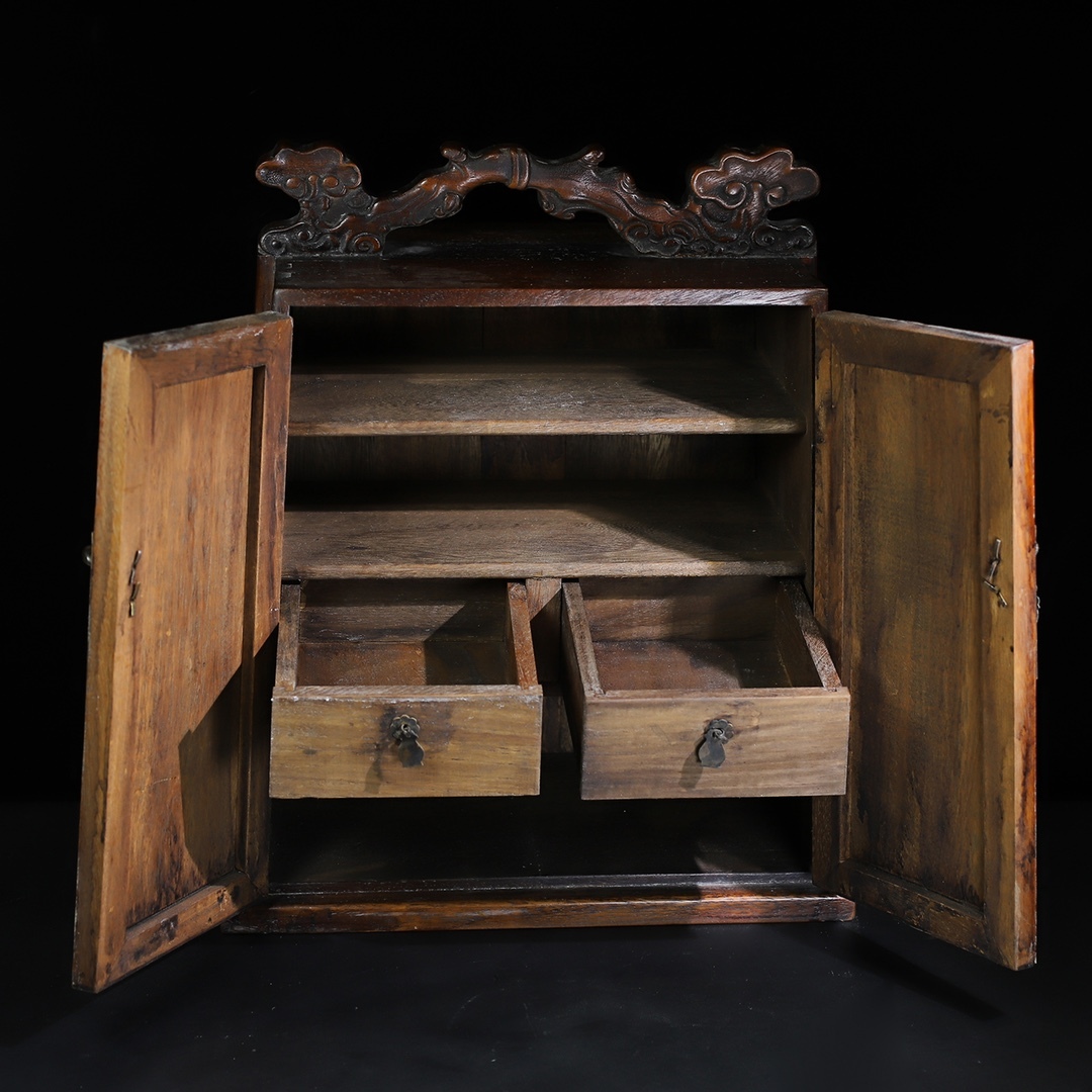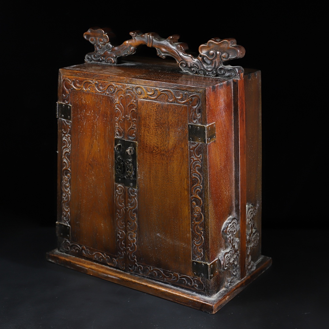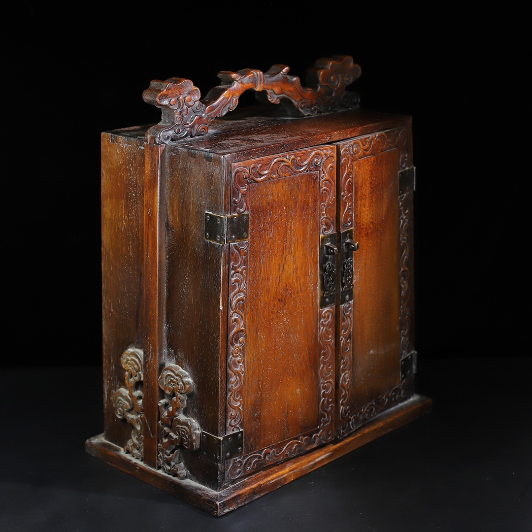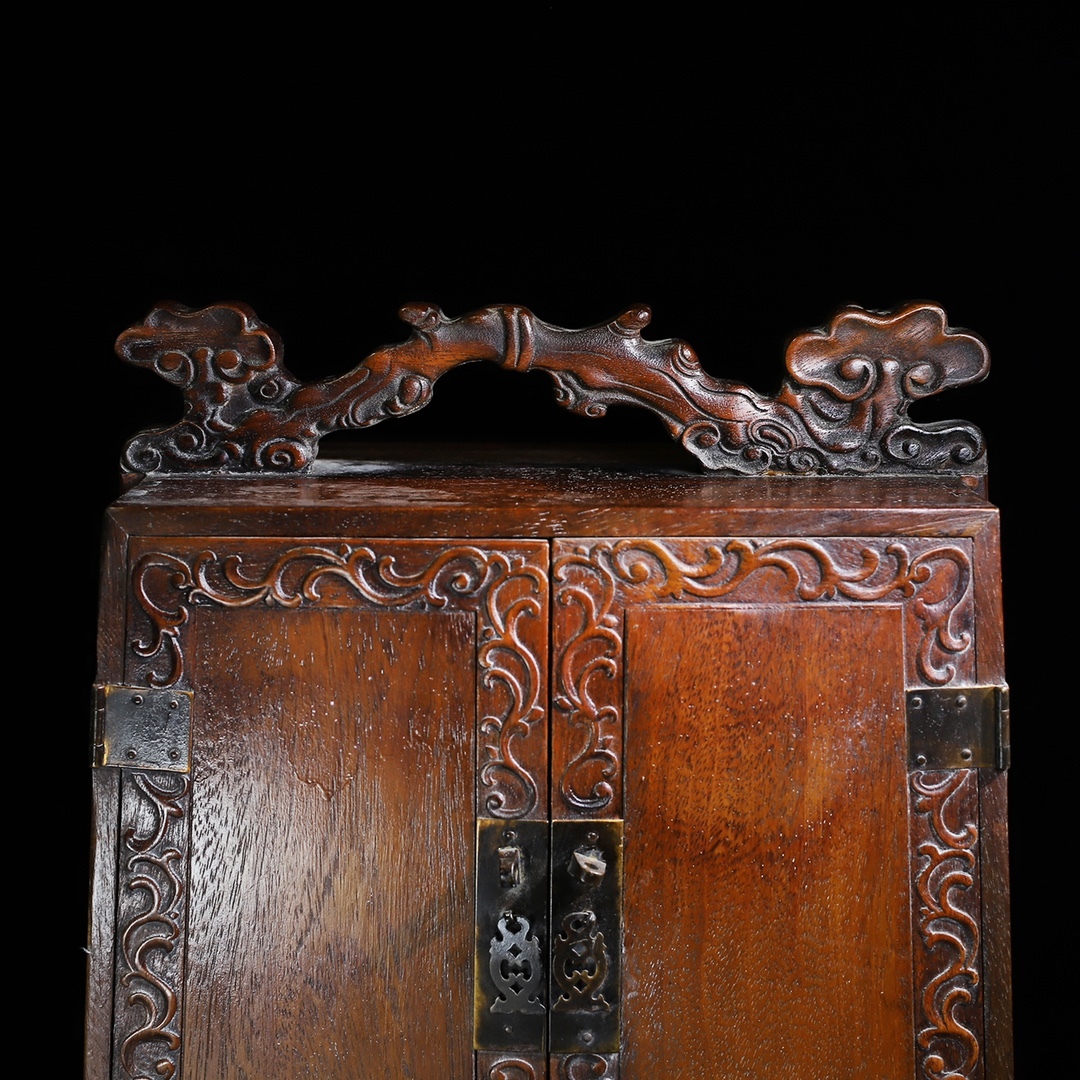 *珍品旧蔵* 清 花梨木 彫刻 霊芝如意提梁 対開扉戸棚 木製 極細工 中国古玩 骨董品 古美味 H48