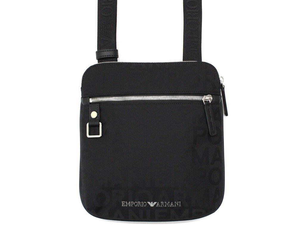 6万新品◆EMPORIOアルマーニ ロゴ総柄×メタルロゴ 軽量スリム クロスボディバッグ ショルダー 黒