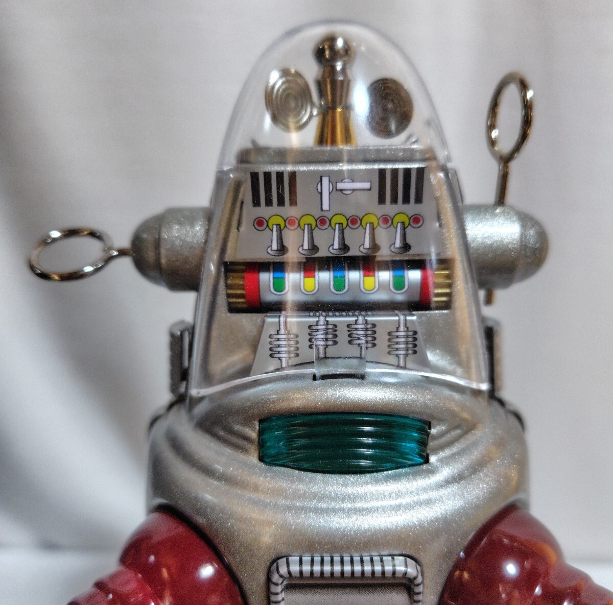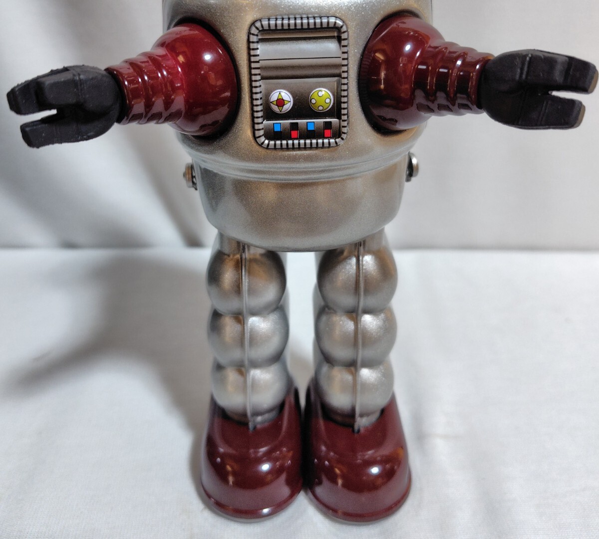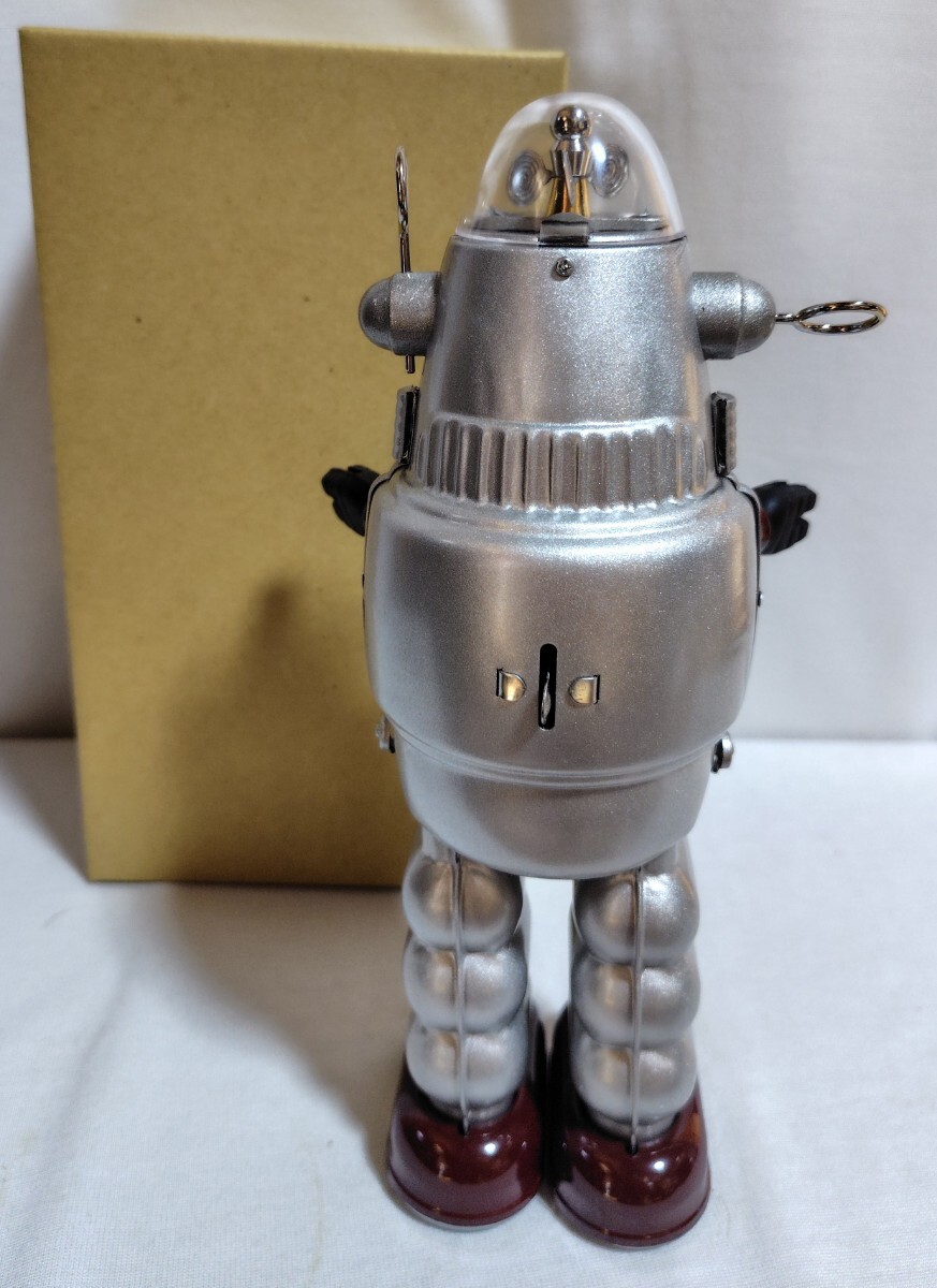 長期保管品です。飾ってませんので、変色、錆は無いと思います。アンテナが回転し、顔の中のドラムが回り、首の緑の所が発火して歩行します。全て作動します。ブリキ玩具ですので、元々多少の小傷があります。箱は、多少傷み、汚れがありす。大阪ブリキ、日本製です。