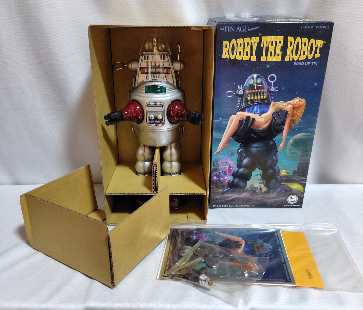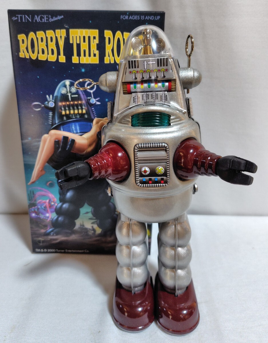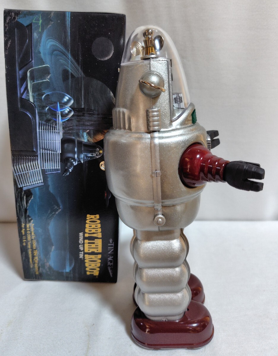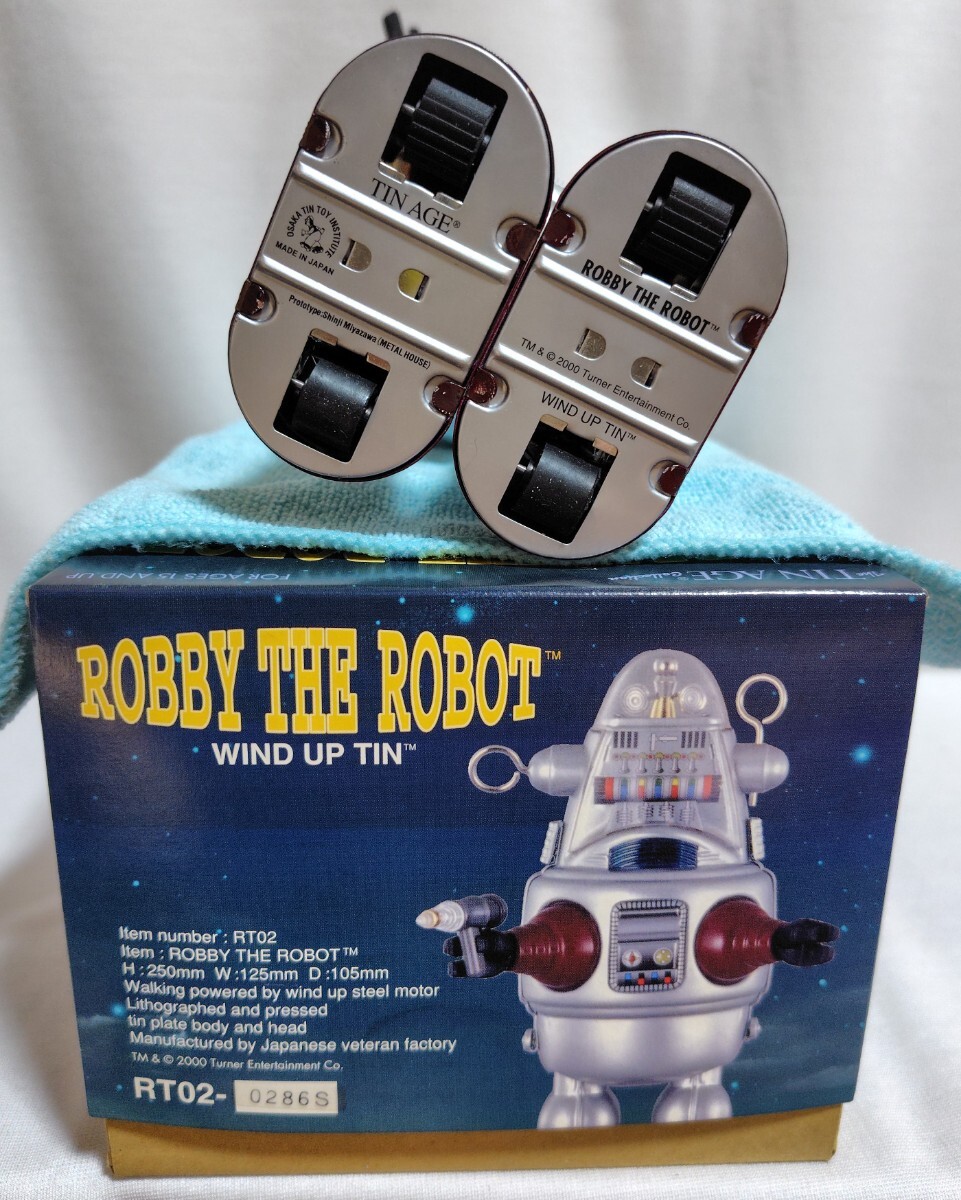長期保管品です。飾ってませんので、変色、錆は無いと思います。アンテナが回転し、顔の中のドラムが回り、首の緑の所が発火して歩行します。全て作動します。ブリキ玩具ですので、元々多少の小傷があります。箱は、多少傷み、汚れがありす。大阪ブリキ、日本製です。