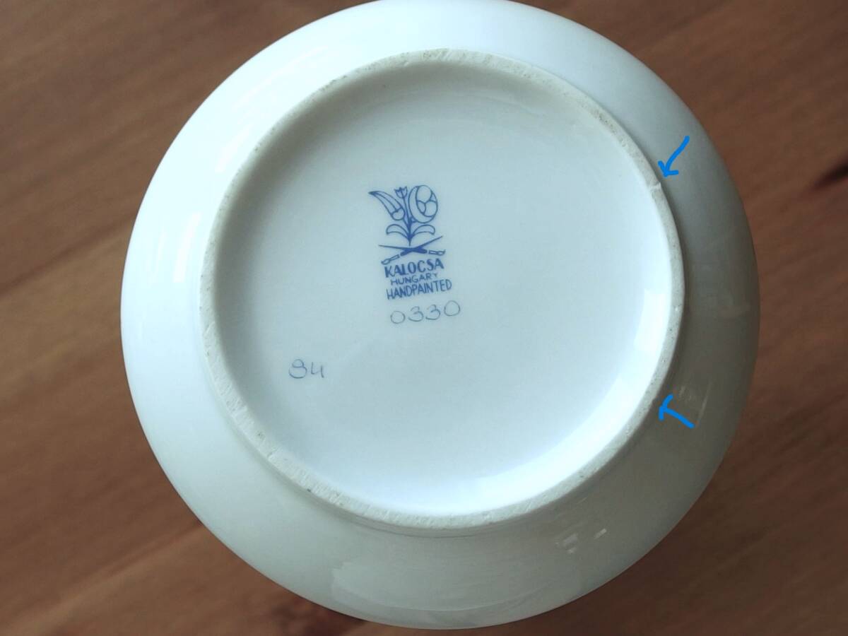 底の高台にとても小さなカケがありますが、作品の雰囲気を損ねるものではありません。ひび割れ、傷&ペイントロスと言ってダメージはありません。