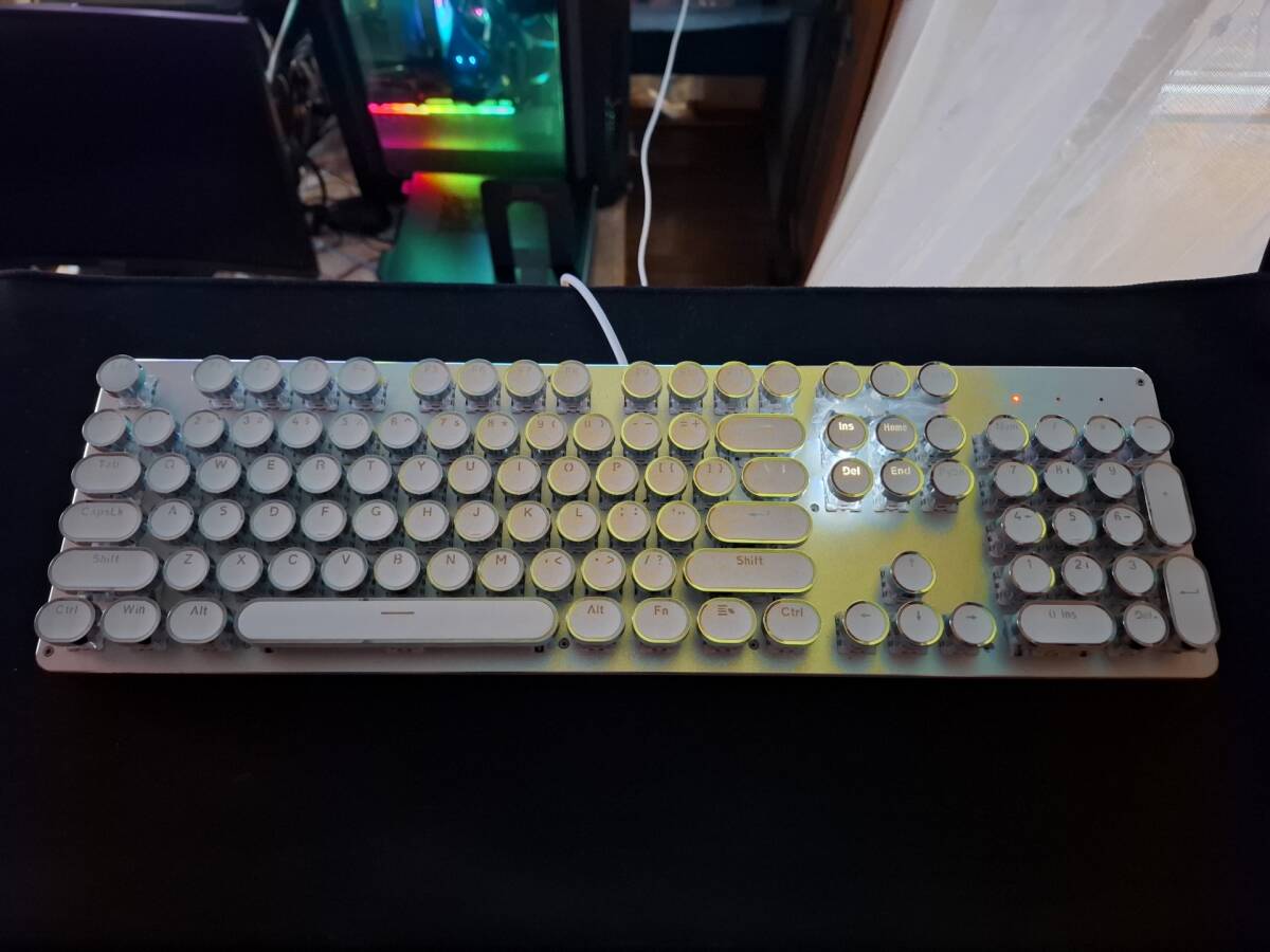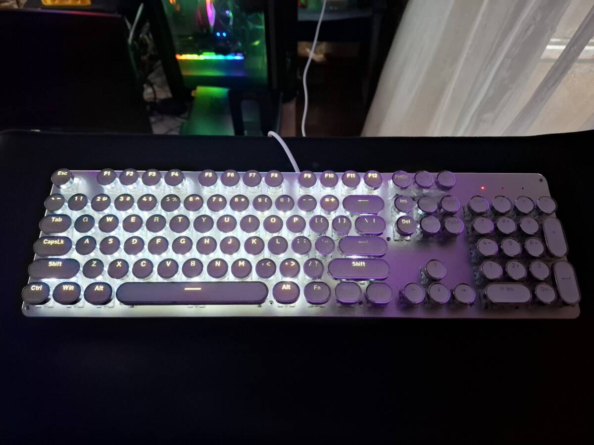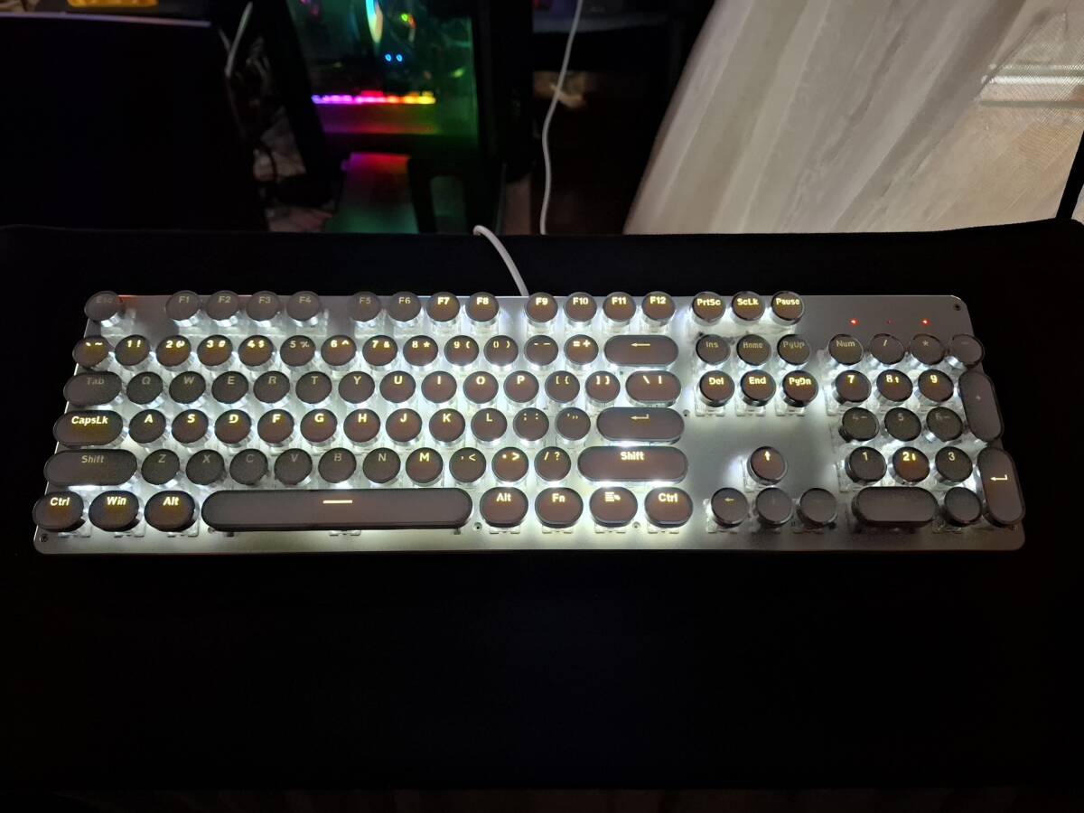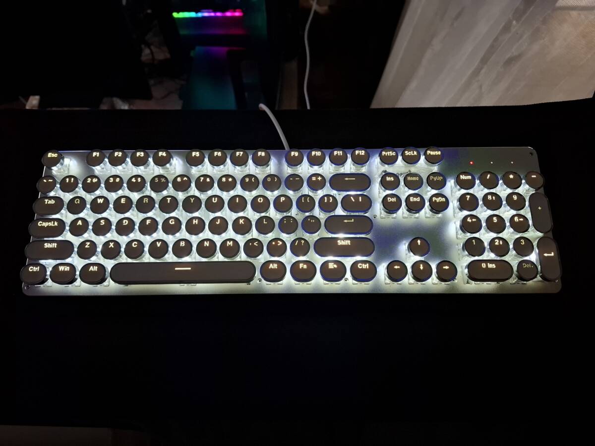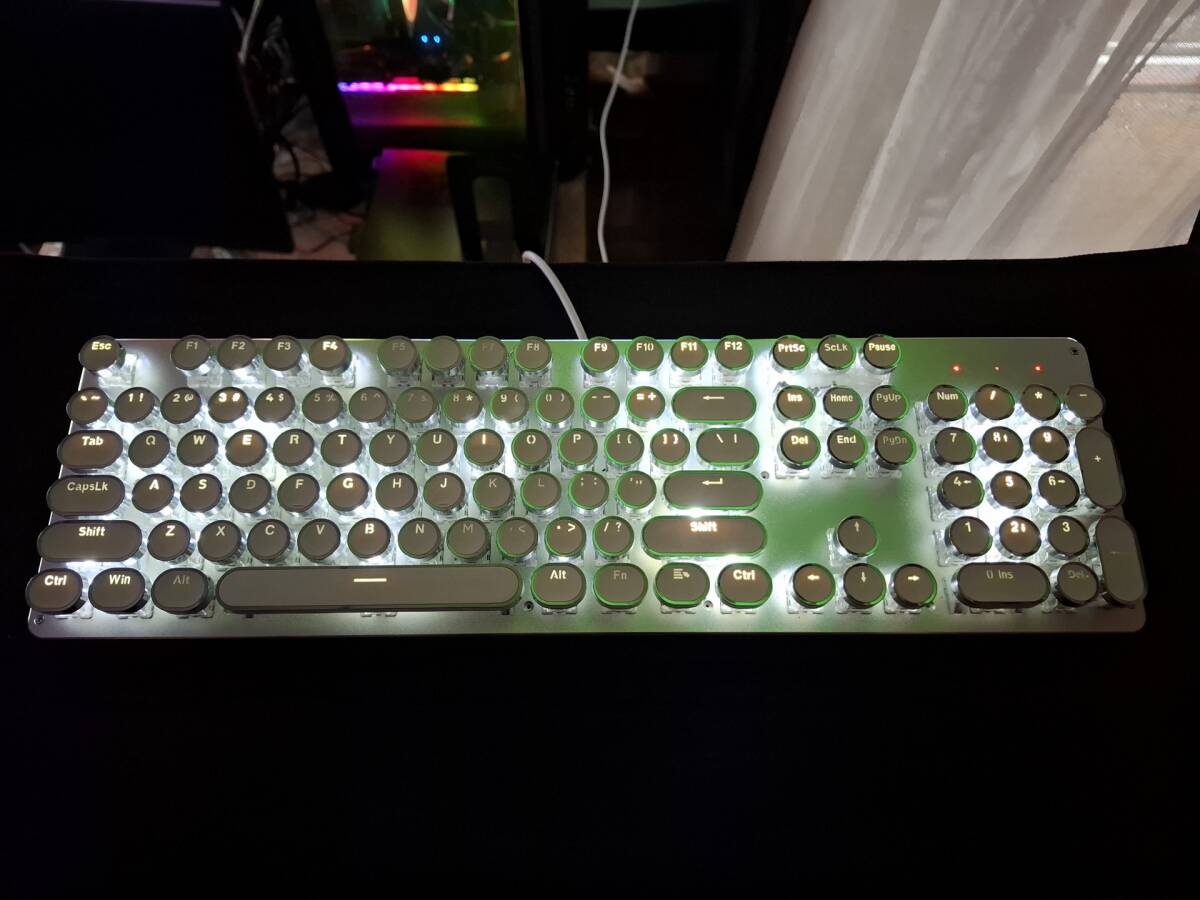無線タイプライター風キーボードが欲しかったので今年4月にアマゾンで新品を購入しましたが、内蔵の無線とブルートゥースが正常に動作しなかった為使わずに保管していました。バッテリーは内蔵されたままだと危険だったので取り外してあります。有線接続なら特に問題は見られないようです。当説明文も動作確認がてらこのキーボードで入力しています。16種類のバックライトモードと呼吸モードを切り替えが可能だそうです。参考画像は部屋のRGBライトが反射してる場合がありますが、当製品のバックライトはホワイトのみです。
