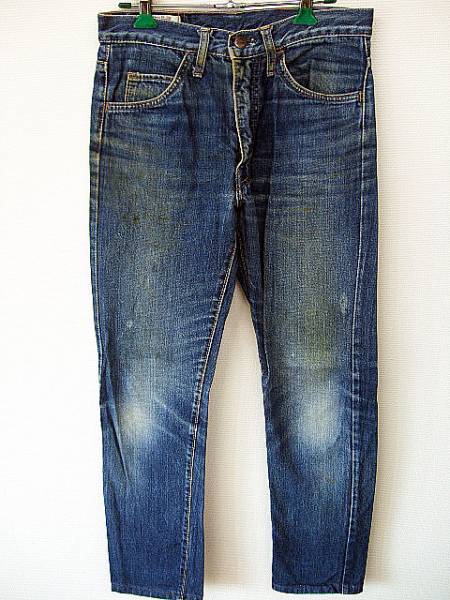 BIG-JOHN ジーンズです。年代物と思われます。濃紺ながらもコントラストの激しい色落ちをしており、メチャかっこいい一本だと思います!!シルエットもなかなかタイトです。◆表記サイズ…W29 L32 実寸サイズ…ウエスト約71cm 股下約71cm 腿幅約26cm 裾幅約16cm◆USEDです。シミがいくつか見受けられますがダメージ等御座いません。全て良い味になっていると思います。◆