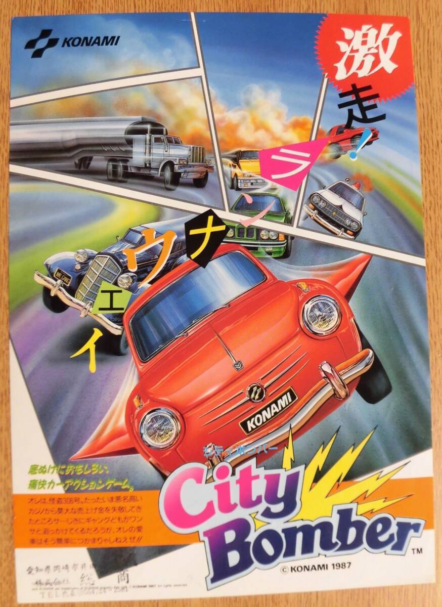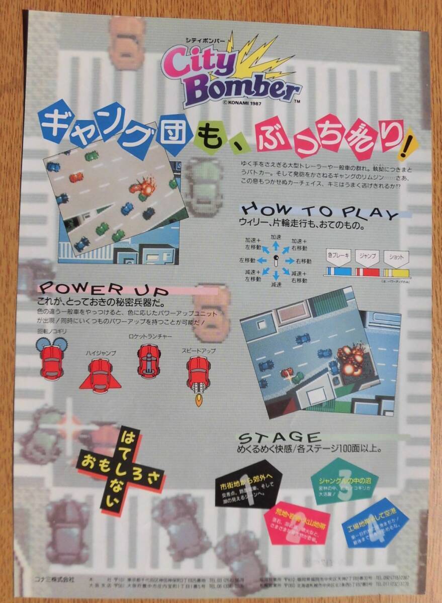1987年 コナミ 【 シティボンバー( City Bomber) 】 A4のカタログ1枚・・痛快アクションゲーム・・取扱店のゴム印押してあります