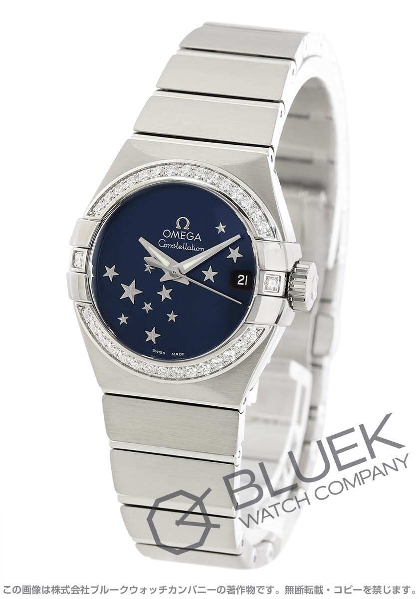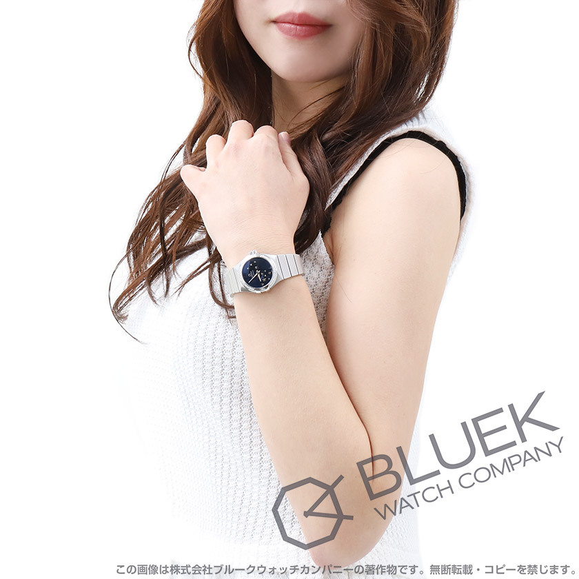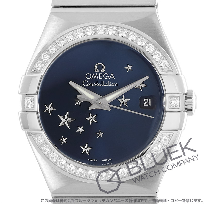 18Kホワイトゴールド製のスター煌めくブルーダイヤルを32粒のダイヤモンドベゼルで縁取った厚さ12ミリの27ミリ100m防水ケース&ブレス小ぶりなサイズも女性らしいコンステレーションは、手元で眩いばかりに煌めくダイヤモンドが女性を手元からラグジュアリーに彩るオメガ人気のタイムピース。女性用には珍しいクロノメーター認定自動巻きムーブメントコーアクシャルキャリバー8520を搭載して3時の窓に日付表示し、シルバー指針にはホワイトの蛍光塗料が塗布されて暗所でも視認性を発揮します。中でもダイヤモンドベゼルを“4つの爪”が掴んだ佇まいにも気品溢れるこのモデルは、プッシュ式の両開きバックルも魅力。ケースバックからは機械の奥深い世界が鑑賞できて機械式時計初心者から上級者までおすすめです。 |