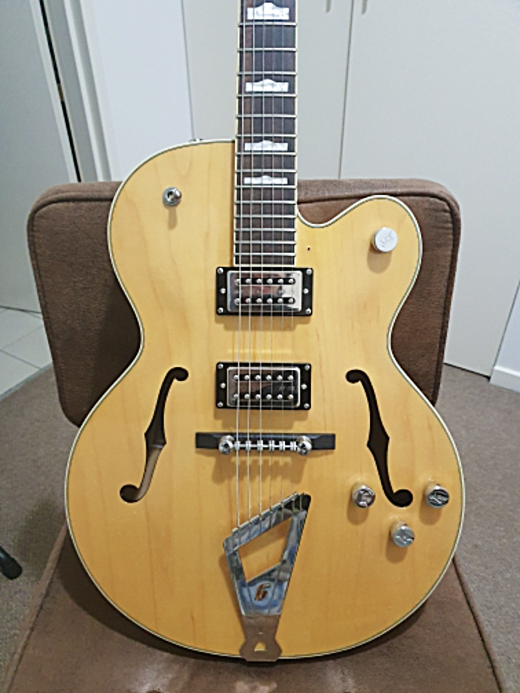 台座はローズウッドで、アーチトップボディに合わせた若干のアールがついております。
