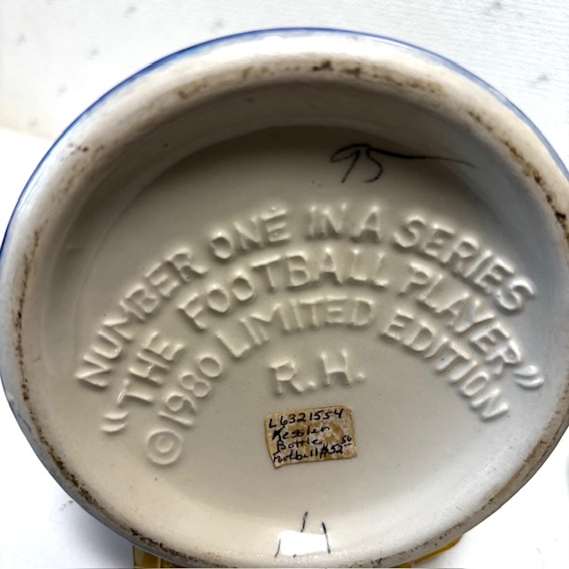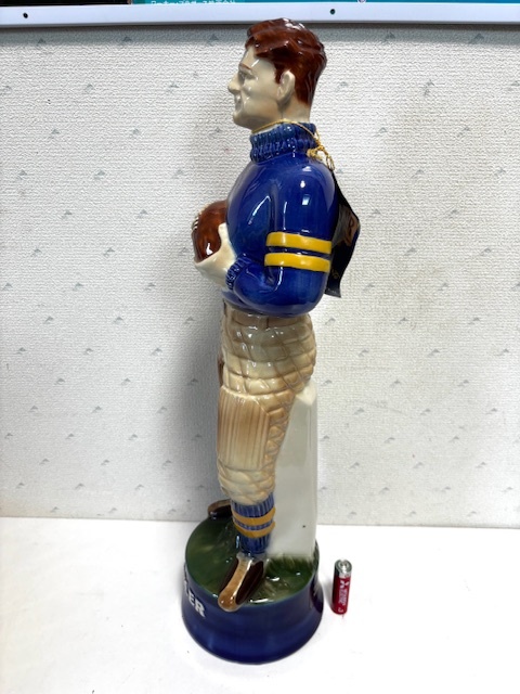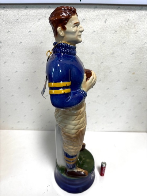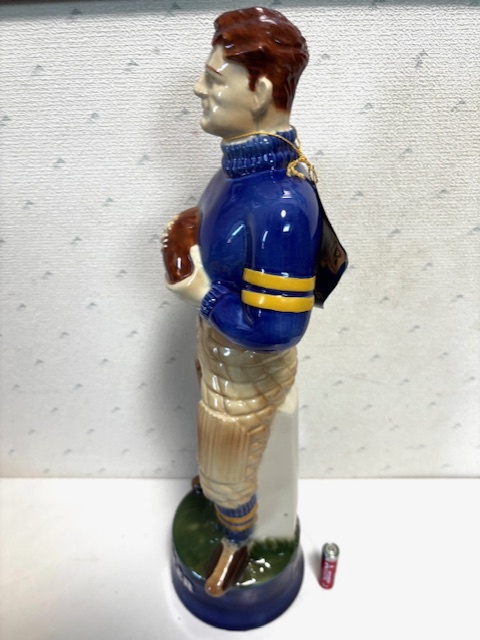 1980年ケスラー酒瓶「フットボールプレイヤー」、シリーズ第1弾。ケスラー限定版デキャンタの希少なヴィンテージ品(オリジナルボックス付き)です。「フットボール選手、スポーツスピリット」は、フットボール選手をデザインしたセラミックシリーズ第1弾です。蓋は本体の上半分/胴体部分になっています。美しい色合いのデキャンタは、バー、フットボール、またはスポーツをテーマにしたお部屋やエリアに最適です。1980年代初頭にケンタッキー州ルイビルで製造され、非常に綺麗な状態です、とても珍しく日本ではあまり見かけません。35年ほど前にカリフォルニアのアンティークショップで購入。コルク部分は劣化で外れています。