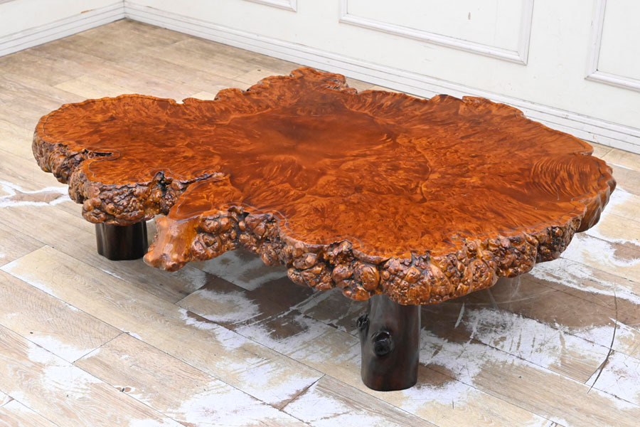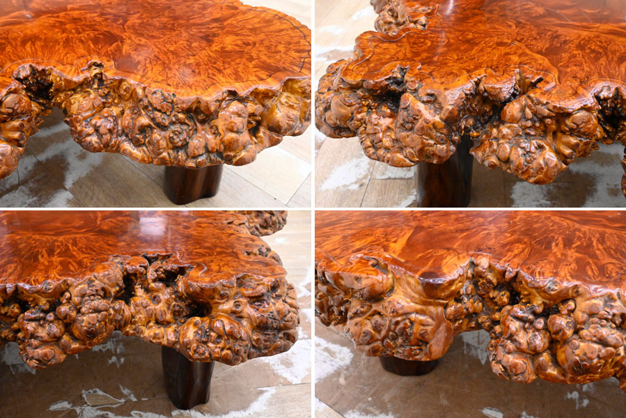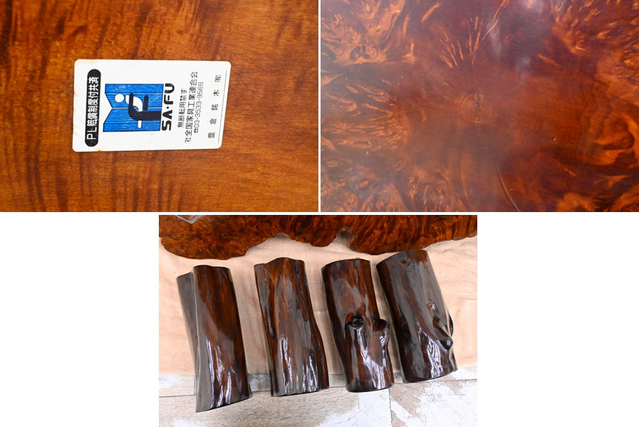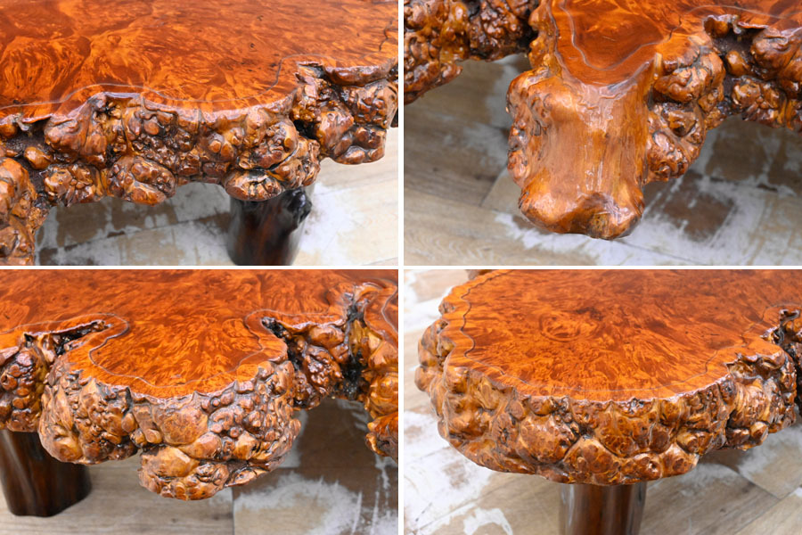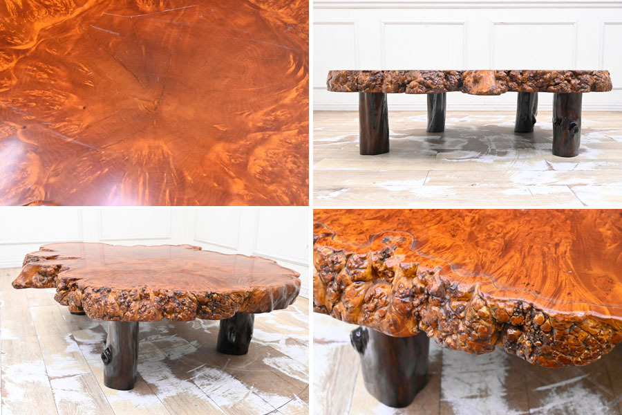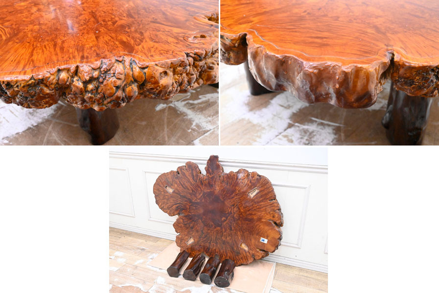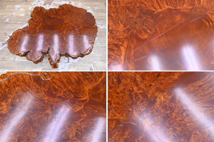 ----------------------------------------------------------------------------------------- ●送料や注意事項は必ずご確認下さい。落札後にトラブルになるケースが増えております。● ◆コンディションは写真・文章にて記載して有りますが、全てのキズの写真は掲載致しておりません。大きなダメージを除き見落とし、記載漏れが有る事はご了承下さい。 ◆当サイトにて出品する商品は多種多彩で、当方商品知識の無い物も多数ありますので落札後の質問やメンテナンス等にはお答えできません。 ◆入札された時点で、画像、文章をご理解していただいたものと判断させていただきます。不明な点は前もってQ&Aからお願い致します。入札後の質問やお電話等でのキャンセルは一切受け付け致しません。 ◆商品説明に「ノークレーム」と記載しているものに関しては、如何なる状況で届いても保証致しません。詳しくは注意事項の「商品到着後について」の最後に記載しておりますのでご確認下さい。 ---------------------------------------------------------------------------------------- 楓一枚板を使用した座卓、中古品の出品です。 希少な瘤材を贅沢にも8.5cmと言う厚みで作ったお品ですのでお見逃しの無いように。 幅138x106 高36.5 厚み8.5cm 【コンディション】 天板コーティングベタツキ、線キズ、スレ等有ります。 ガタツキありますので調整して下さい。 脚に欠けあります。 | ||
