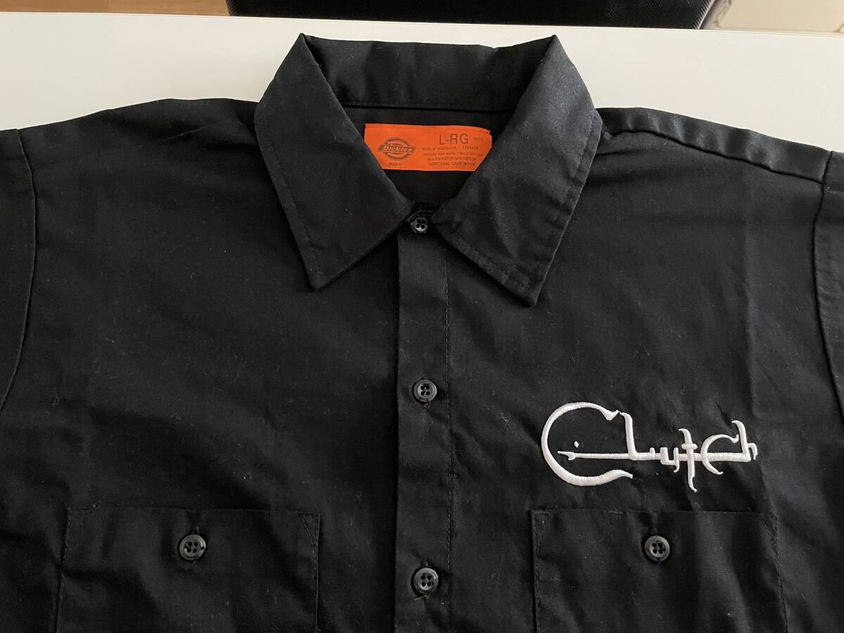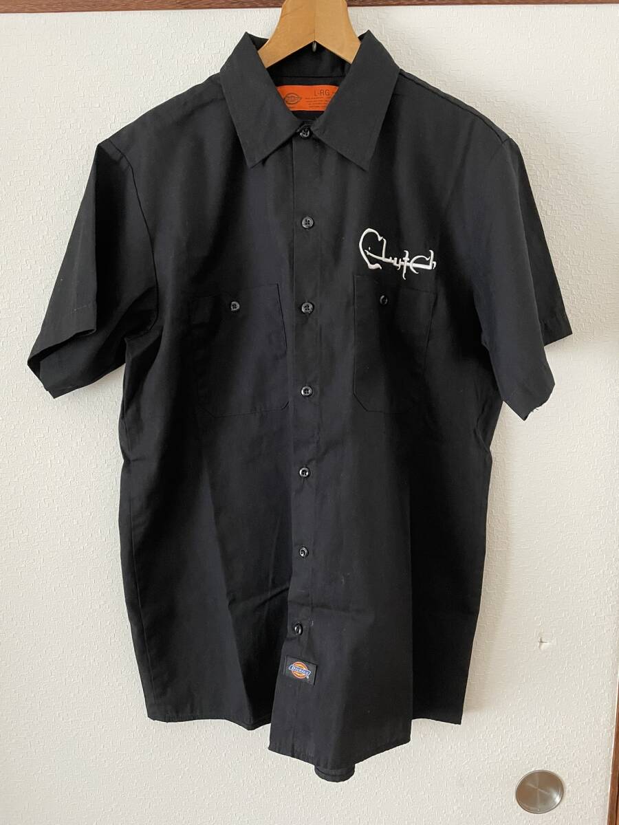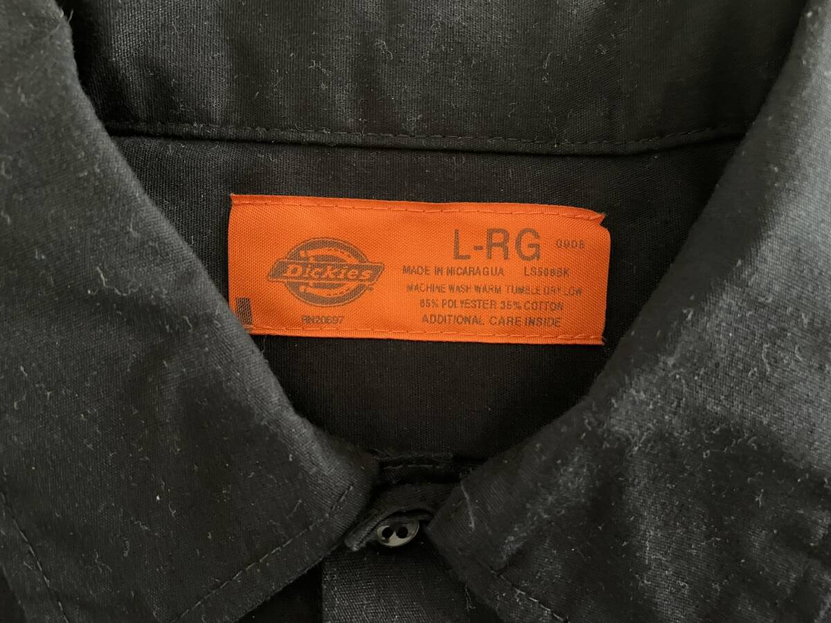 ディッキーズのワークシャツです。中南米製、色は黒、サイズ表記はLで実寸は身幅60cm、着丈80cm、肩幅47cm、袖丈23cmくらいです。