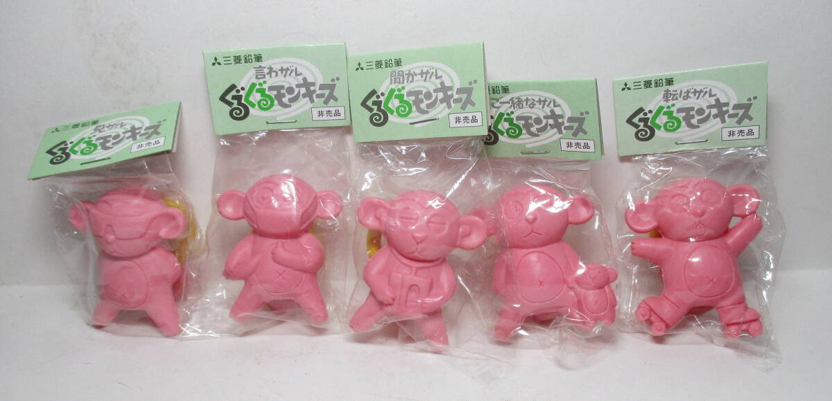 レトロ三菱鉛筆 ぐるぐるモンキーズ 消しゴム 5種セット 未開封 非売品 ピンク 1997年 ぐるぐるモンキーズ 「見ザル」「言わザル」「聞かザル」「ご一緒なサル」「転ばザル」の5匹のサルです サルのしっぽは、いろんな所に巻き付けたり、つなげたり、ひっかけたりと遊び方も色々です。 替芯1個を購入で「三角くじ」を1枚を引くことができ、当たりが出たら プレゼントされた品です 状態は画像でご確認下さい。 定形外郵便290円で発送します。