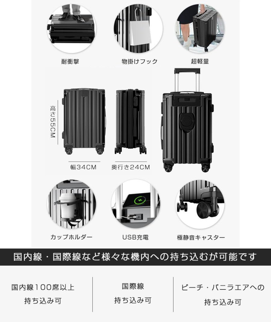 スーツケース キャリーケース 超軽量 大容量 41L 耐荷重150kg 多機能 360度回転 静音 USBポート付き 機内持ち込み ブラック zchw0094.1