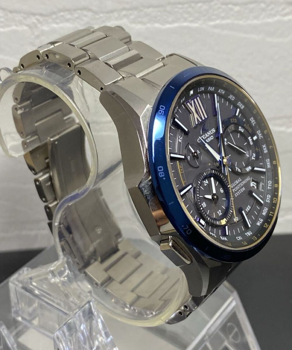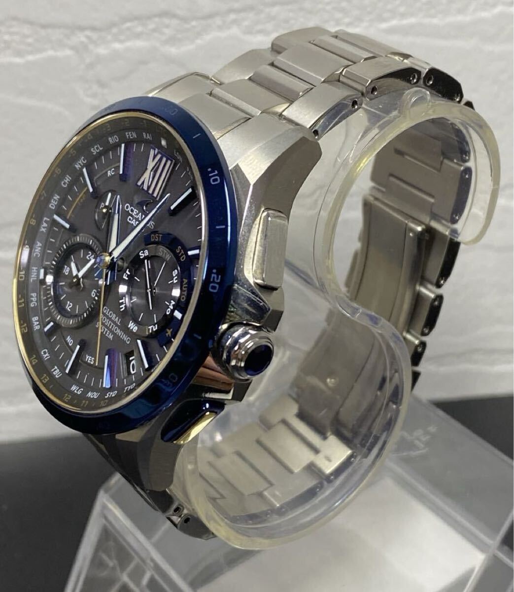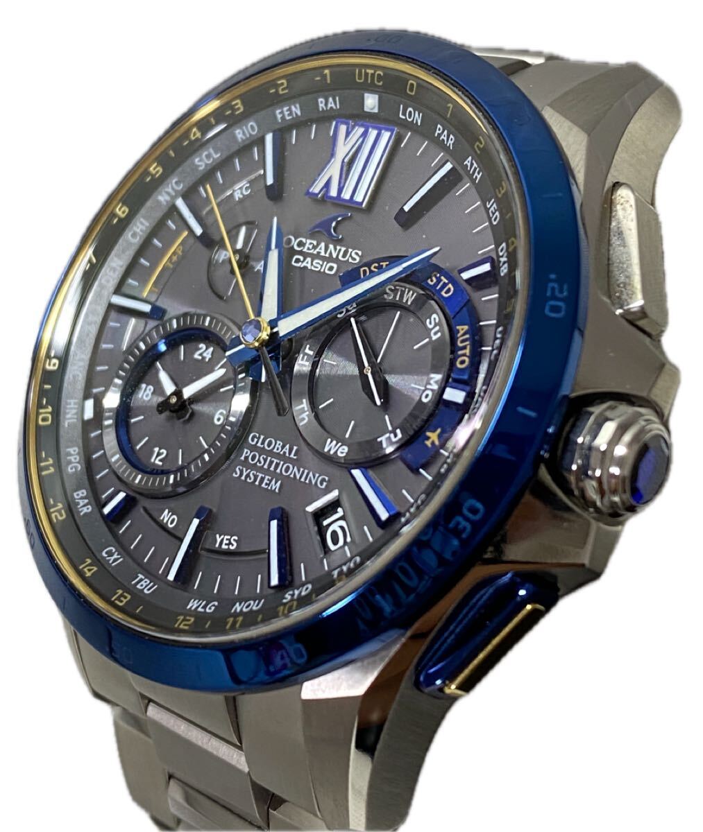 2004年の誕生以来、Elegance Technologyをブランドコンセプトに、上質と高機能を追求し続けるオシアナスからGPSハイブリッド電波ソーラー※OCW-G1000シリーズのスペシャルモデルが世界限定2000本で登場!ブラックマーブルと呼ばれる宇宙から見た夜の地球をイメージしたカラーリングを施し、秒針やベゼル内側のリングのゴールドアクセントが地球上のライトを表現、ベゼルやインダイアルリングなどのネイビーブルーは地球上の暗闇を表現しています。ディテールにもこだわり、ベゼルには新開発のネイビーブルーIPを施し、りゅうずトップと針軸の中心部には再結晶ブルーサファイアをあしらい、厚みのある立体的なローマ時字には白蝶貝を施しています。また、秒針は様々な角度からの視認性を保つために甲丸立体秒針を採用しいます。