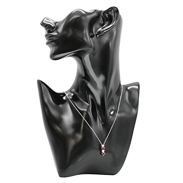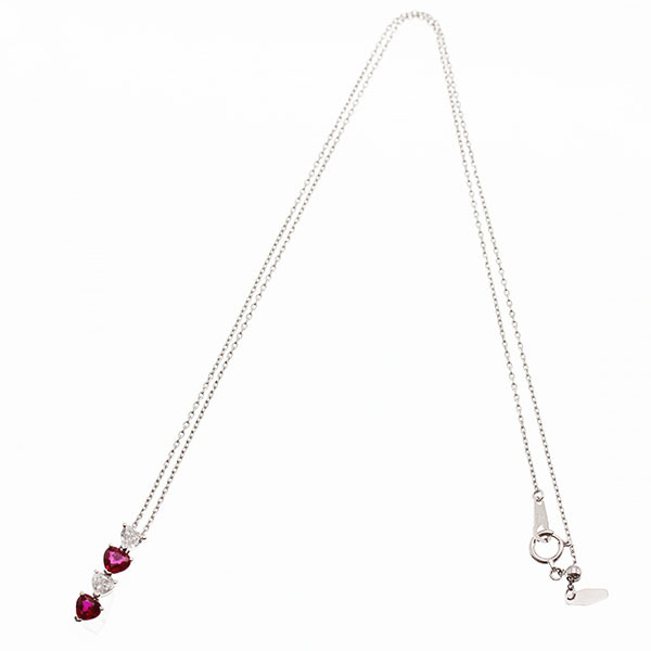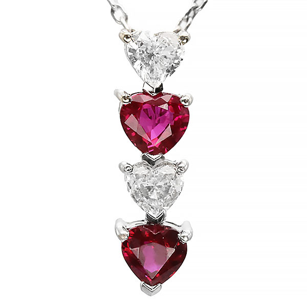 ハートシェイプのルビーとダイヤモンドが寄り添う、ロマンティックなネックレス。深紅の輝きと透明感あふれる煌めきが胸元で優しく揺れ、上品さと可愛らしさを同時に演出。特別な日の装いにも、日常のワンポイントにも華やぎを添えてくれるアイテムです♪
