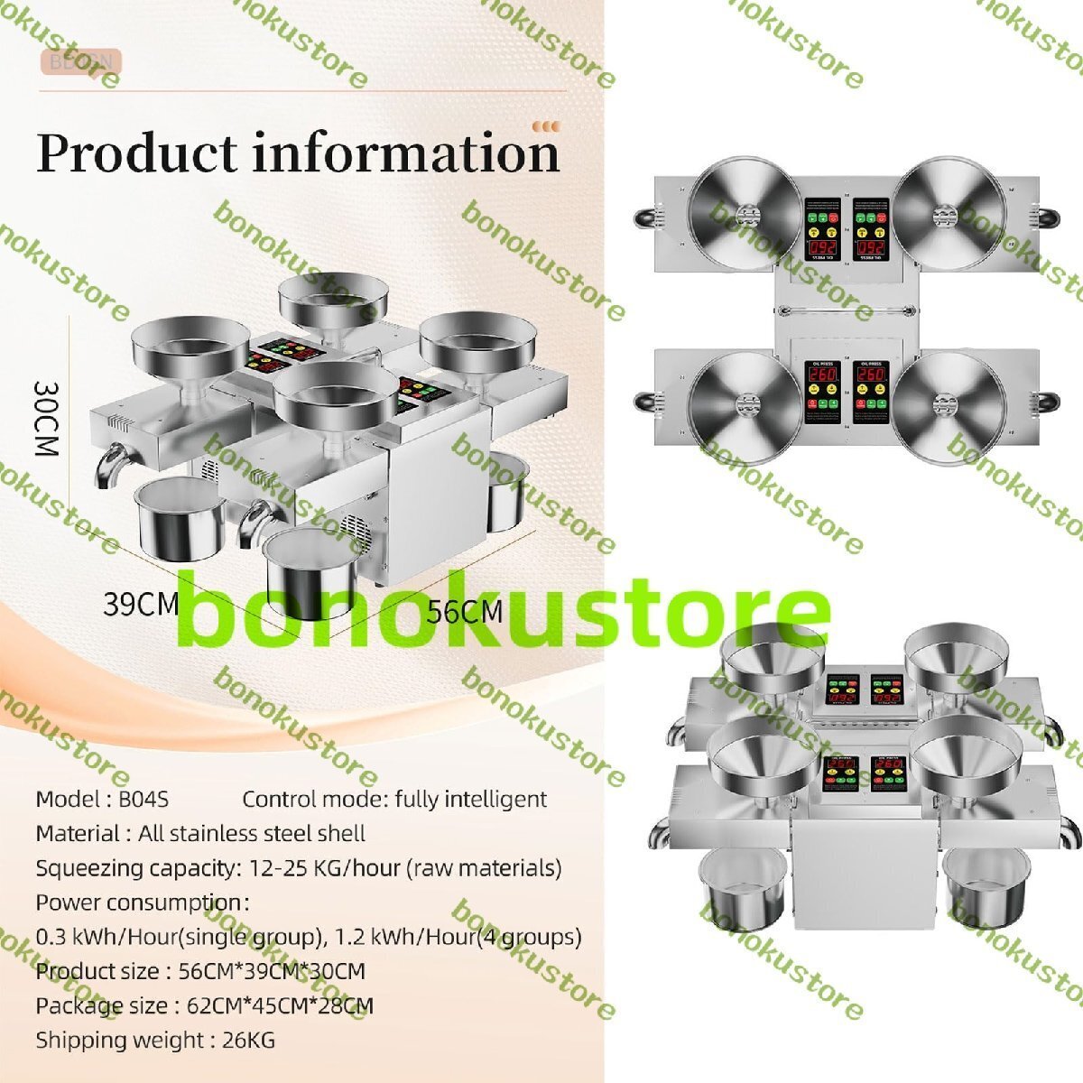 名称:インテリジェントオイルプレス 電圧:220V/110V 材質:ステンレス プレス能力:12~25kg/時 消費電力: 0.3 kWh/h (シングルヘッド)、1.2 kWh/h (4ヘッド) 寸法: 56x39x30 cm 梱包サイズ:62x45x28 cm パック: 1x4ヘッド油圧プレス