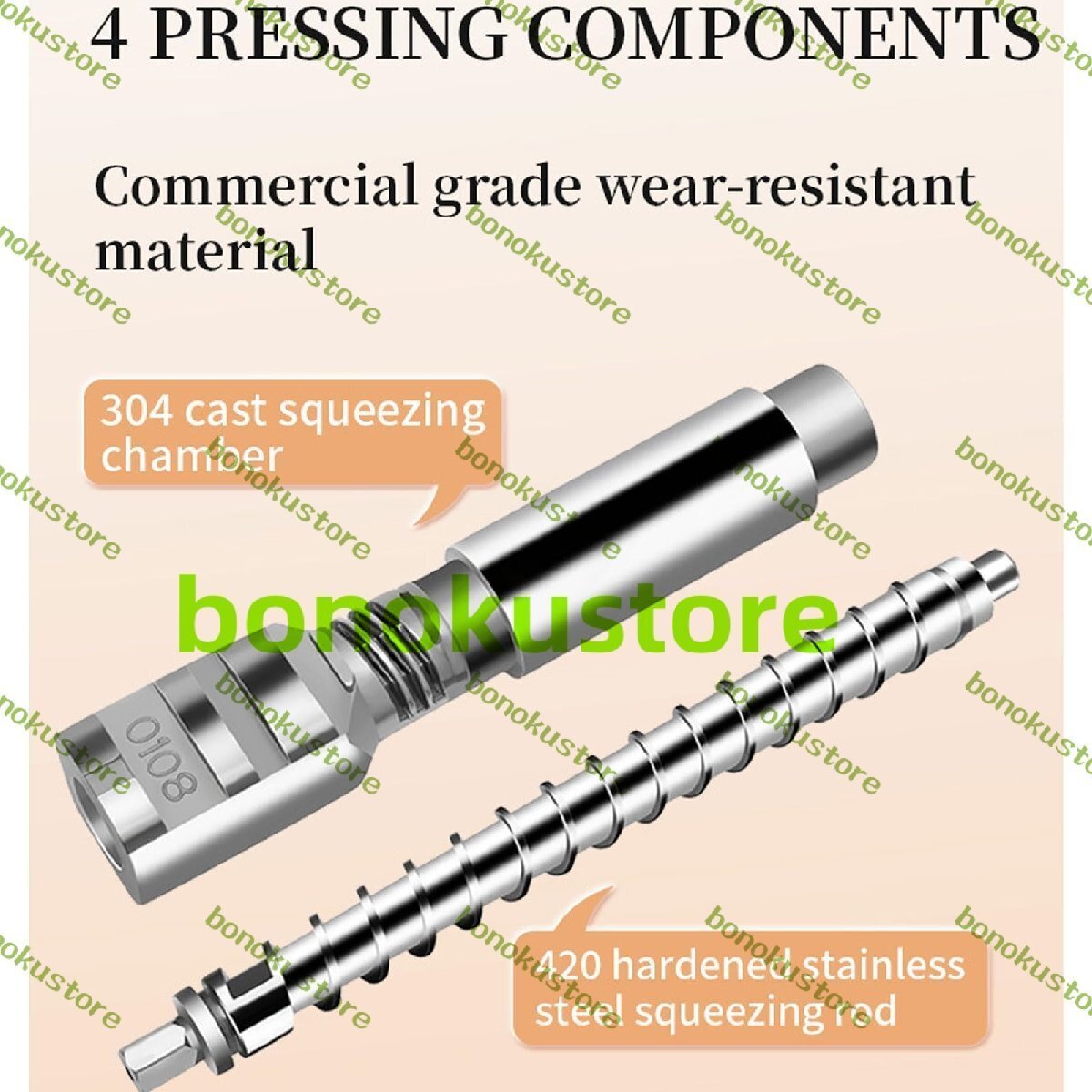 材質:本機はステンレス製で、ダブル4段ギアを内蔵しています。多段ギアは摩耗が少なく、24時間連続稼働可能です。炭素鋼製なので長寿命です。プレス速度:12~25kg/h
