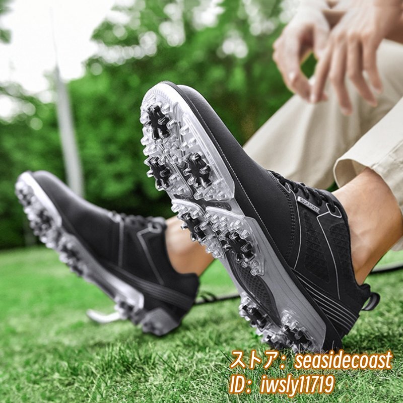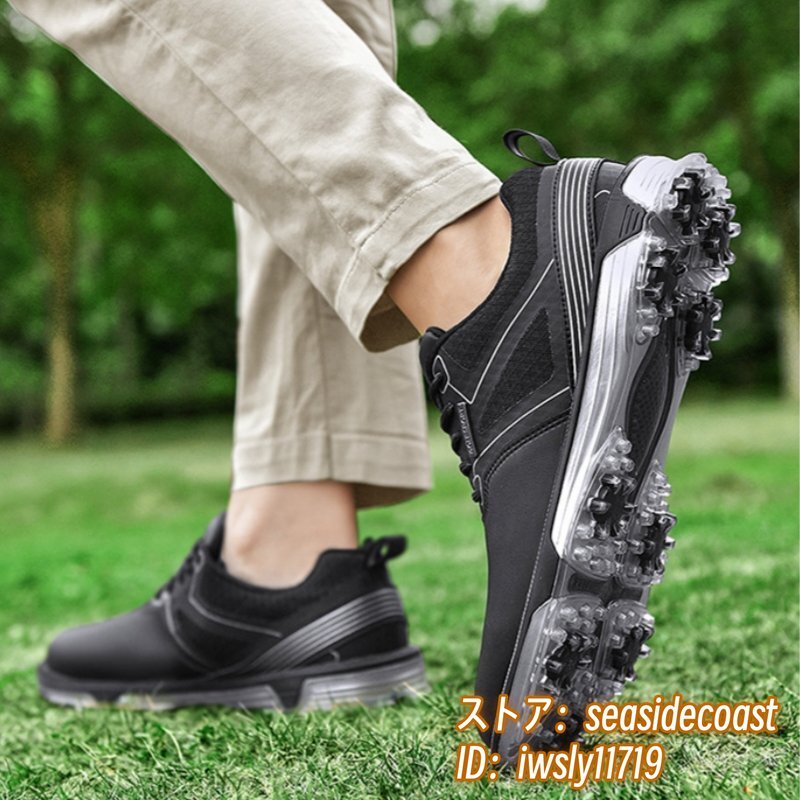 高級品 メンズ ゴルフシューズ 運動靴 フィット感 スポーツシューズ スパイク 強いグリップ 軽量 弾力性 通気性 防滑耐磨 撥水 黒 25.0cm