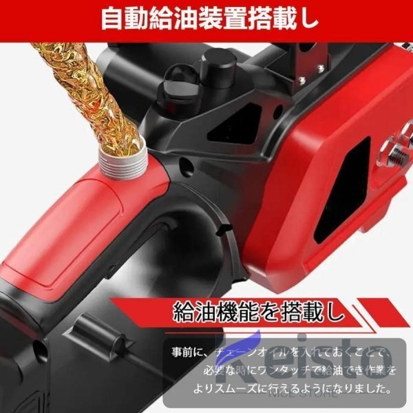 チェーンともガイドバーとも高温で焼き入れた高品質な素材を採用してできたので、高硬度で耐摩耗性、耐食性に優れ、鋭くて断裂しにくいです。更に、9M/Sの超高速チェーンスピードは非常に強力で、これまで以上に高くて速い切断効率を実現します。チェーンソー 充電式 12インチに最大30cm以内の丸太をカットすることができます。また、 チェーンとガイドプレートの耐用年数を延ばすために、よりスムーズかつ高速に切断する自動ポンプオイラーを追加しました。