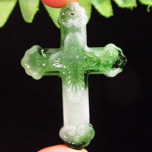 翡翠 ヒスイ ネックレス ペンダント 手元に有ります。彫刻されたグリーンホワイト翡翠クロスペンダントビーズ 60x42x8mm
