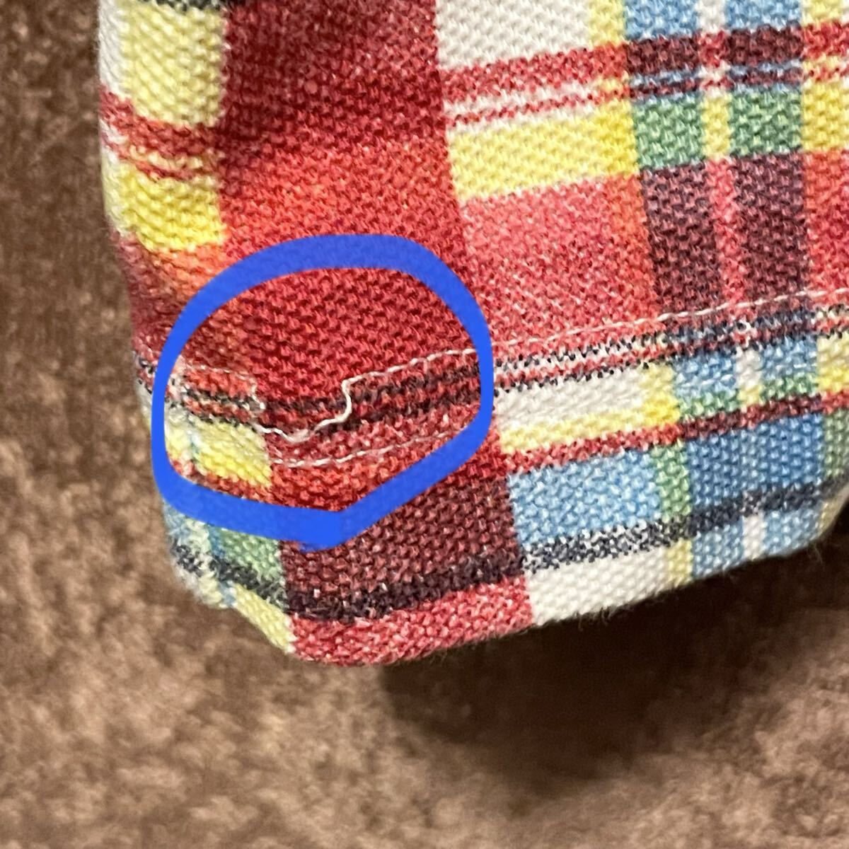 青丸部分の裾のステッチに一部ほつれがございます。