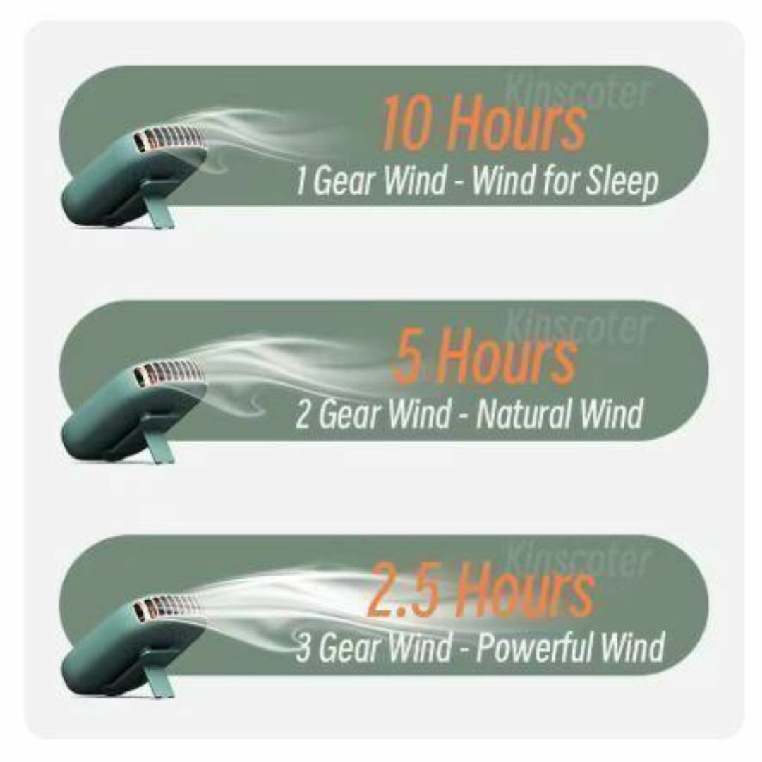 バッテリー寿命: 1 速で約 10 時間、2 速で約 4.5 時間、3 速ファンで約 2.5 時間