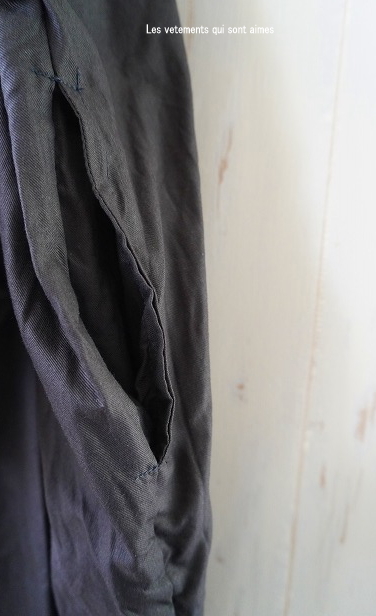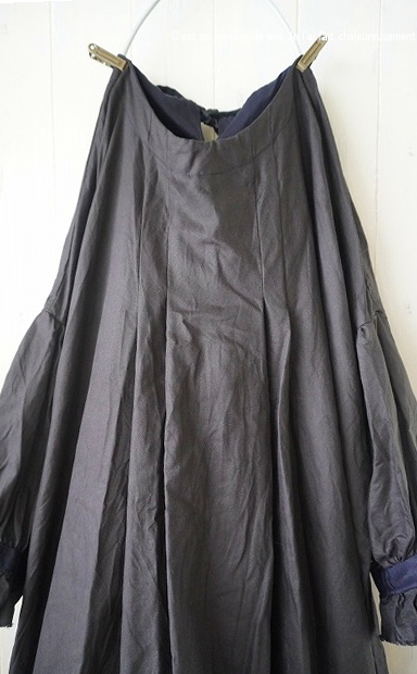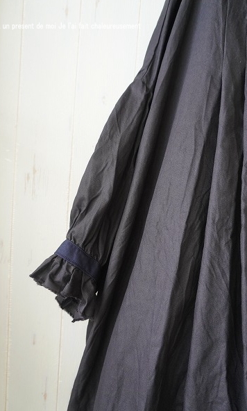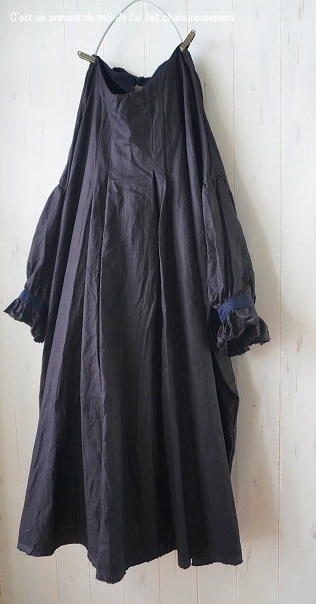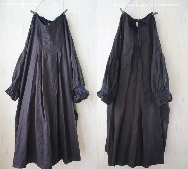 * *お品もの詳細* 柔らかくあまり透け感の感じない チャコールブラック コットン生地です。 気になる時はインナーを重ねてください。 フロントとバックにタックを入れて バックにスラッシュ切り替えを リボンで留めて 袖は肩線切り替えが長い ドロップショルダー 耳使いの袖口に生地を縫い付け パフスリーブ。 裾は耳使いで仕上げています。 **サイズ**(平置きでの採寸です) 着丈 約99cm 身幅 約60cm+タック 裄丈 約65cm **お届けします時は水通し後ノーアイロン 自然乾燥でのナチュラルなお届けです。** 多少の誤差はお許しください。 ::ほかにも出品しております::: |