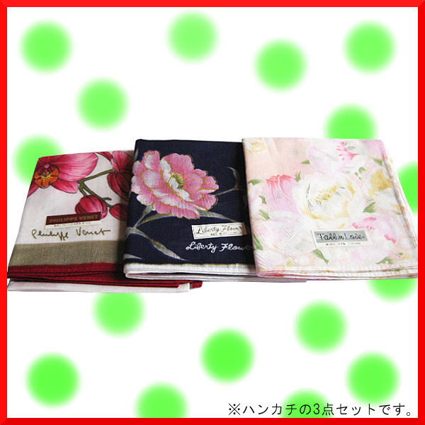 ★未使用品 ◎画像=②③④ ●メーカー= PHILIPPE VENERT(フィリップブネ) ●カラー= ホワイト×レッド ●平置きサイズ= [タテ:約42cm×ヨコ:約42cm] ・・・ ◎画像=⑤⑥⑦ ●メーカー= fallinlove ●カラー= ピンク系 ●平置きサイズ= [タテ:約42cm×ヨコ:約42cm] ・・・ ◎画像=⑧⑨⑩ ●メーカー= Liberty Flower(リバティーフラワー) ●カラー= 紺系 ●平置きサイズ= [タテ:約43cm×ヨコ:約43cm] ・・・ ★備考= 3点共、そごうで購入した商品です。 【サイズ表記の注意】:お客様との測り方で多少の誤差は生じるかも分かりません。 ご理解の程、宜しくお願い致します。 | ||