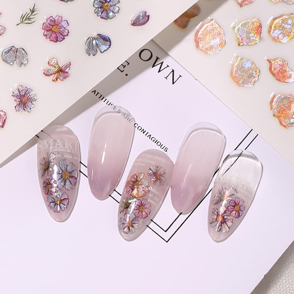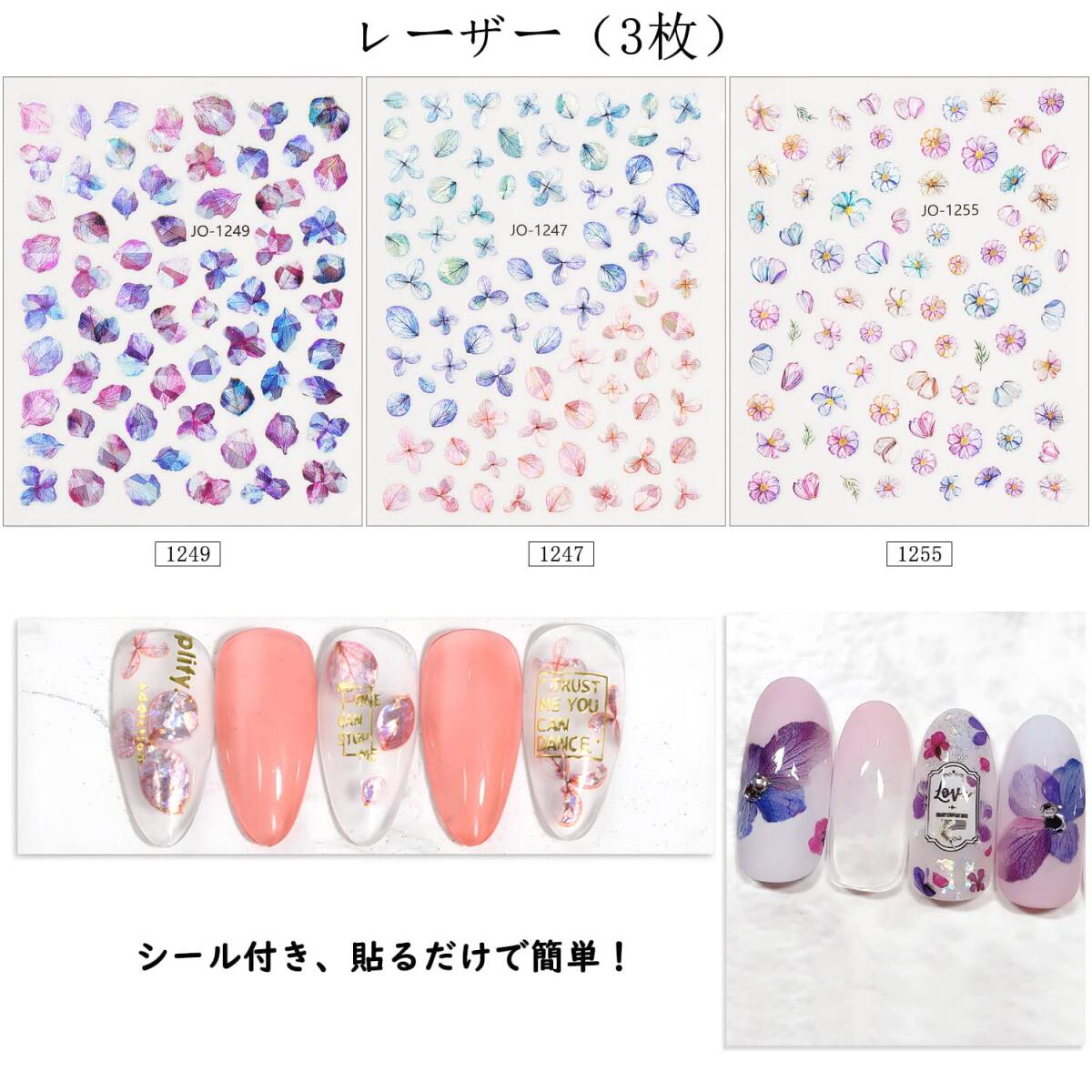 【貼るだけ】ネイルシールの裏は粘性が強く、ピンセットで外して爪に直接貼り付けます。ご注意:破損防止のため,台紙から優しく丁寧にはがしてください