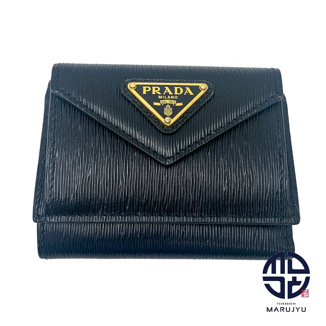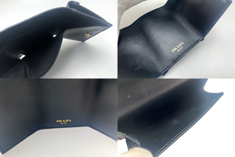 プラダより、三つ折り財布になります。ブランドらしく、メタルのトライアングルロゴがあしらわれています。コンパクトなサイズ感でミニバッグにぴったりです。カード×3枚収納可能です。ABランク。コバ部分に軽微な剥がれあり。正面金具少々剥げあり。内側に汚れ、コイン入れ内側にやや汚れがございますが、まだまだお使いいただけます。 | |