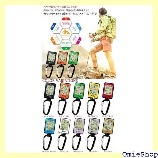 機能一覧:高度計、気圧計、気温計、湿度計、電子コンパス、天気予測、時刻表示
