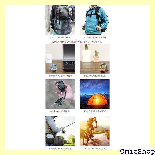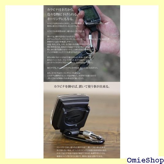 デジタルコンパス:方位と方角を表示。 ●温度計、湿度計:温度と湿度を元に、現在の状態を3段階(多湿、快適、乾燥)で表示。 ●カラビナの汎用性は高く、様々なところで使える。カラビナ付きだから色々な物に下げられる。キーリングにもなる。カラビナを倒せば、置いて使うことも可能。外で使わない時は、オフィスやリビングでも使える汎用性の高さ。裏蓋はコイン等ですぐに開けて、簡単に電池が出来る。フックウォッチ クリップウォッチとしても使用可能。