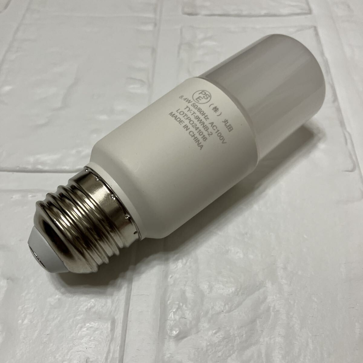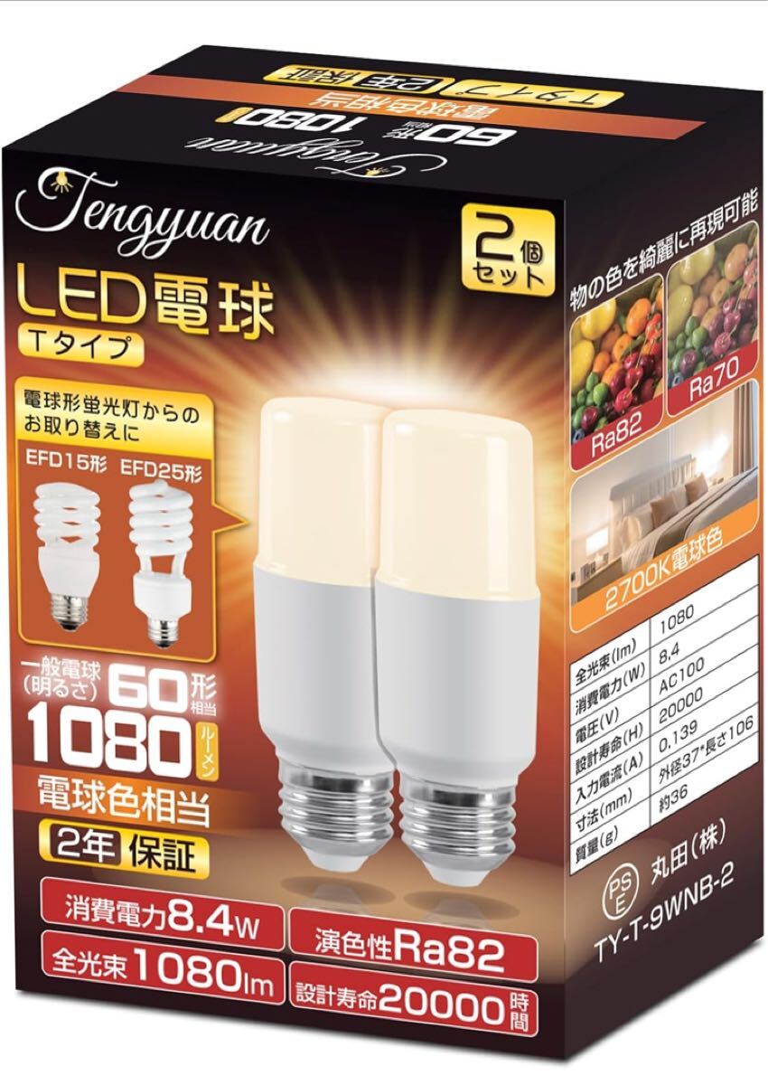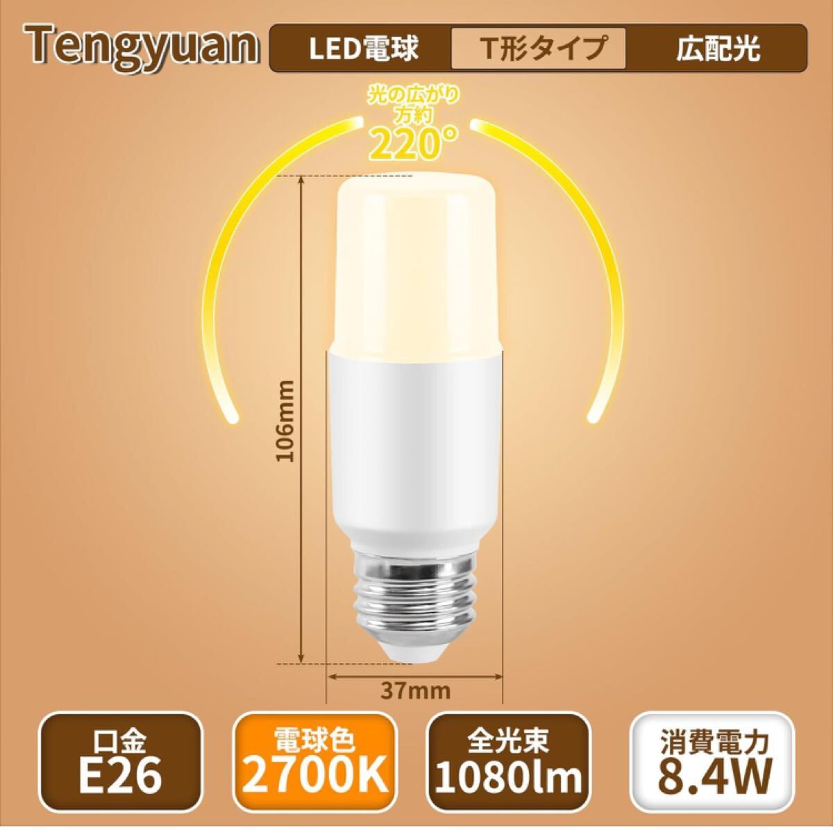 【商品仕樣】口金サイズ:26mm、電球サイズ:長さ106mm*直径37mm、消費電力:8.4W、定格電圧:AC100V 50/60Hz、色温度:2700K(電球色)、全光束:1080lm、演色性:82、ビーム角度:220°、非調光タイプ。