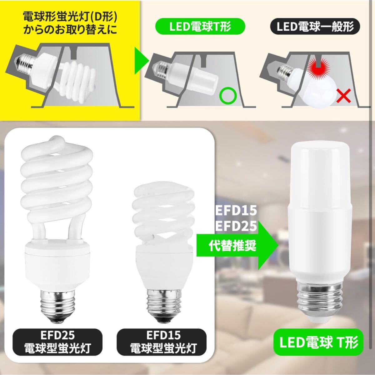 【電球形蛍光灯(EFD)代替推奨】電球型蛍光灯を使用するダウンライトやポーチランプに小さな電球サイズのランプを取り付けると、適切な明るさが得られずにランプの発光部が器具の奥に入ることがあります。T型タイプの全長は電球型蛍光灯と同等であるため、発光部を器具の奥に進入させることなく適正な輝度を確保することが可能です。