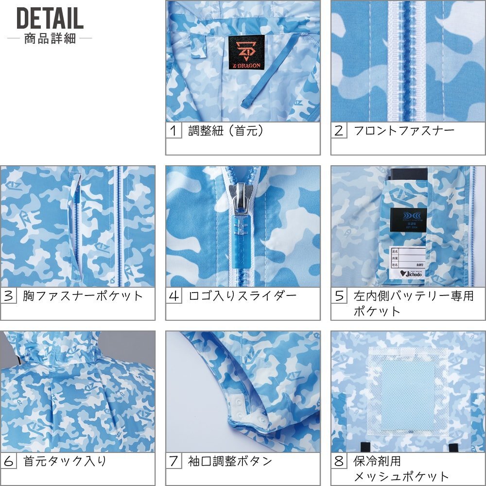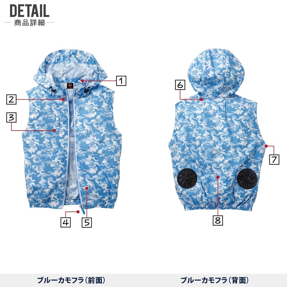 | 空調服説明 & 状態 & 素材 & サイズ & カラー 【画像参照】 | ■空調服 ≪説明≫ トレンドを掴んだカモフラ空調服 ≪状態≫ 新品・正規品 ≪素材≫ ポリエステル100% 高密度タフタ ≪特徴≫ ・調整ヒモ ・左内側バッテリーポケット ・胸ファスナーポケット ・保冷剤メッシュポケット ・首元タック入り ・袖口調整ボタン ・樹脂ボタン ・樹脂ファスナー ≪サイズ≫ タイトル名【 画像参照 】 ≪カラー≫ タイトル名【 画像参照 】 | セット 内容 | ■ファンセット ≪カラー≫ タイトル名【 画像参照 】 ≪内容≫ ・ファン×2 ・ケーブル×1 風量 7.2V設定時:24.4リットル/秒 6V設定時:21.1リットル/秒 5V設定時:18.4リットル/秒 3.3V設定時:12.9リットル/秒 ■:本商品の【 サイズ・カラー 一覧(服単品) 】 ■:本商品の【 フルセット(服+バッテリー+ファン) 】 ■:本商品の【 電池式セット(服+電池ボックス+ファン) 】 ■:本商品の【 ファンセット(服+ファン) 】 ■:本商品の【 大風量フルセット(服+大風量対応バッテリー+パワーファン) 】 ■:本商品の【 備品 一覧 】 □:綿100% 空調服 一覧 □:ポリエステル100% 空調服 一覧 □:フルハーネス 空調服 一覧 |